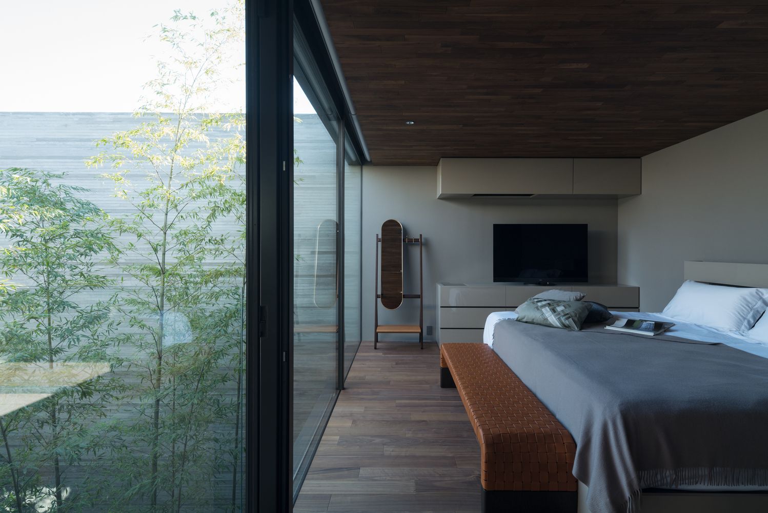 „Glavno dvorište na južnoj strani ima bambuse koji privlače pogled čim se uđe u kuću. Pošto su dnevna, radna i spavaće sobe orijentisane ka ovom dvorištu, klijenti i njihov pas mogu uživati na otvorenom kako žele“, istakli su arhitekti.