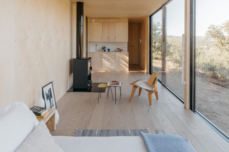 Veći deo raspoloživog prostora zauzima spavaća soba sa bračnim krevetom i dnevni boravak koji je prilagođen sofi, ali je na fotografijama prikazan samo sa stočićem za kafu i šporetom na drva.