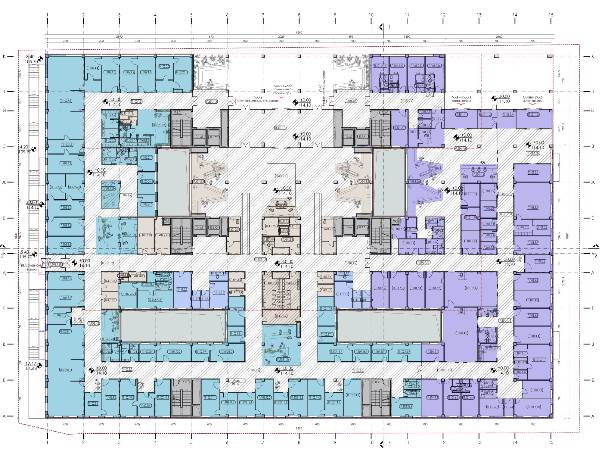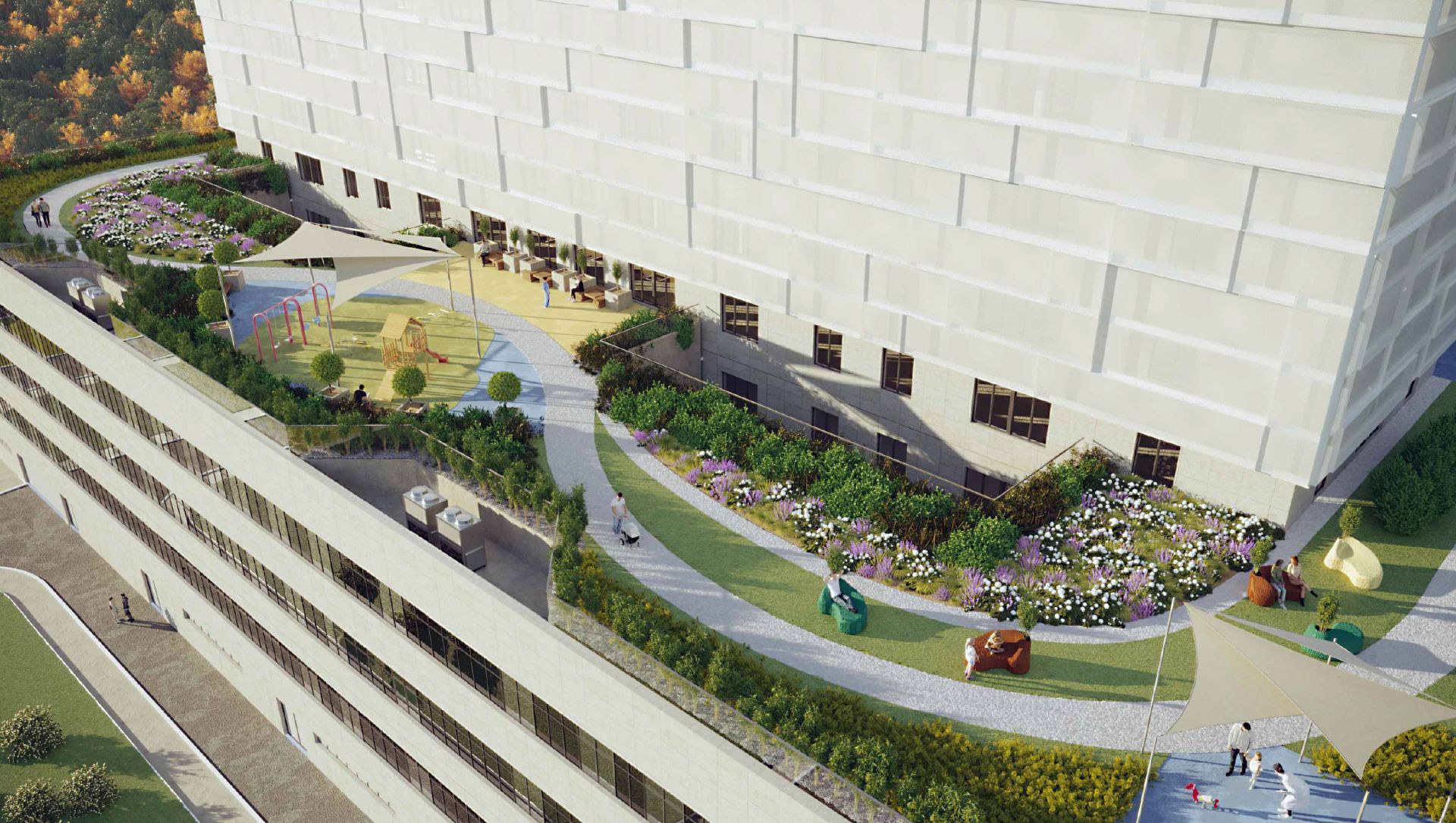 Dopunsko prirodno osvetljenje i provetravanje suterenskih i prizemne etaže omogućeno je formiranjem 4 atrijuma. Krov prizemne etaže se planira kao ravan prohodan i u funkciji je krovne bašte i igru dece na otvorenom.