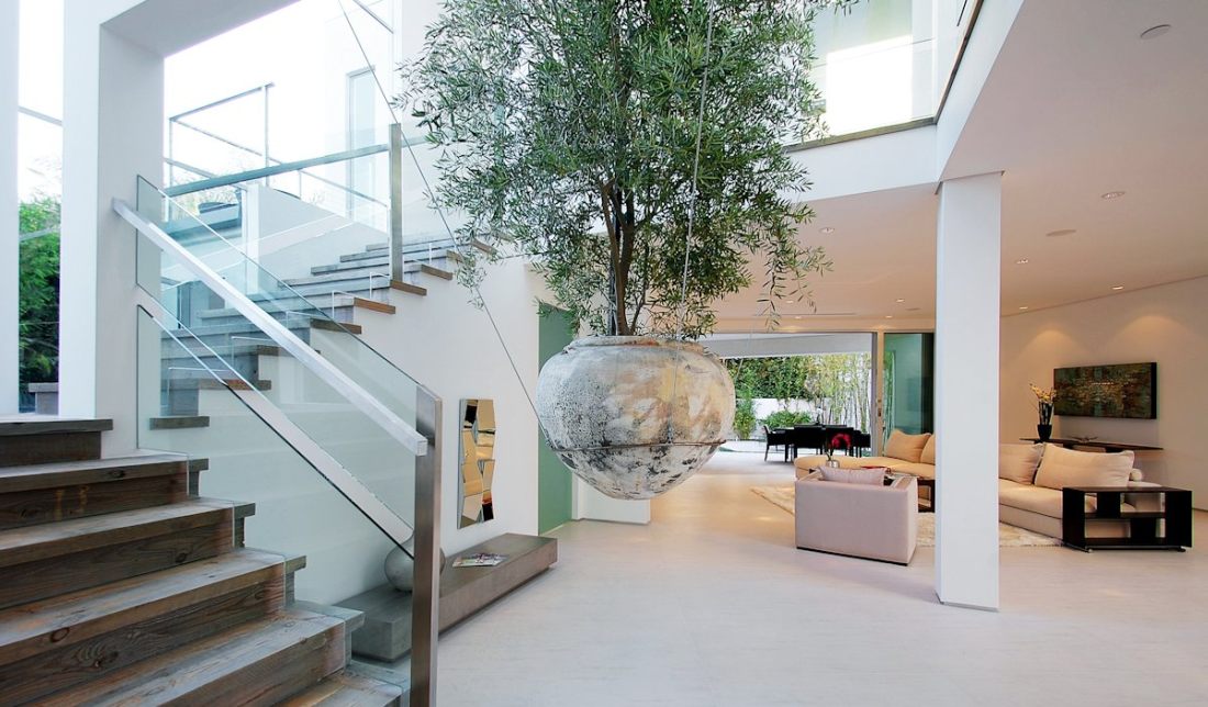 Viđali smo dosta primera kuća koje u enterijeru imaju zasađeno drvo ali se do sada nismo susreli s ovakvo neobičnim rešenjem. Saksija s drvetom teška oko 950 kilograma okačena je čeličnim sajlama o plafon i visi nad centralnim holom kuće. Krošnja drveta dala je ovoj, pomalo hladnoj, galeriji sa stepeništem, preko potrebnu toplinu.