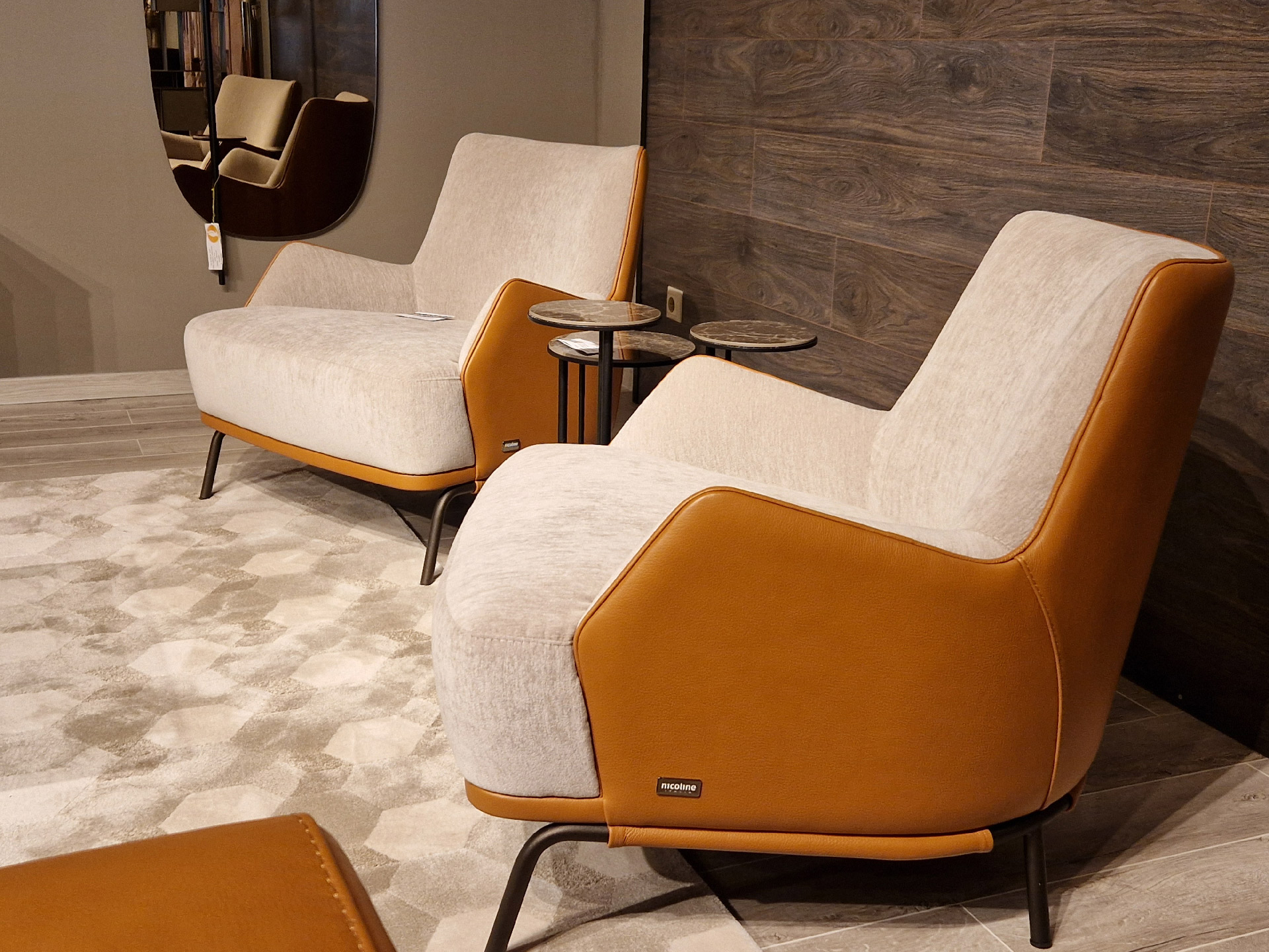 Još jedan model fotelje za ljubitelje kombinacije kože i štofa jeste Ghirla italijanskog brenda Nicoline. Ova fotelja je manjih dimenzija: 78×81 visine 70 centimetara pa se uglavnom postavljaju dve, jedna do druge.