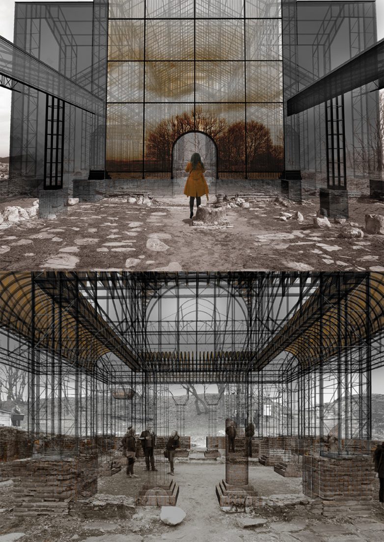 Konfiguracija terena i postojeća saobraćajna infrastruktura na lokaciji kao ulazni podaci formiraju prilaznu zonu lokaliteta Caričinog Grada sa njegove istočne strane. Odmah, nakon prijemnog prostora, pred bedemima lokaliteta nalazi se prvi objekat koji je predmet istraživanja na temu interpretacije u konzervaciji ostataka – Terme. Drugi ciljni objekat za natkrivanje i interpretaciju predstavlja Bazilika s transeptom u neposrednoj blizini od ulaza. Ova ulazna partija kao celina može predstavljati jedinstvenu rekonstruisanu sliku nekadašnjeg Caričinog Grada u sjaju koju nose nove tehnologije u zaštiti arhitekture. Ideja intervencije je veza između konzervacije i interpretacije arhitektonskog nasleđa sa namerom što vernije savremene prezentacije prošlosti. Fokus istraživanja jesu načini na koje se postiže interpretacija pojedinačnih segmenata objekata zaštitnom konstrukcijom ili rekonstrukcijom, uz naglasak na korišćenju materijala i konstruktivnih sistema koji nose pečat današnjice i ne narušavaju integritet stare strukture. Cilj je da se svi slojevi prošlosti arhitektonskog nasleđa sagledavaju čitko i razumljivo, pa čak i oni delovi koje je vreme uklonilo.