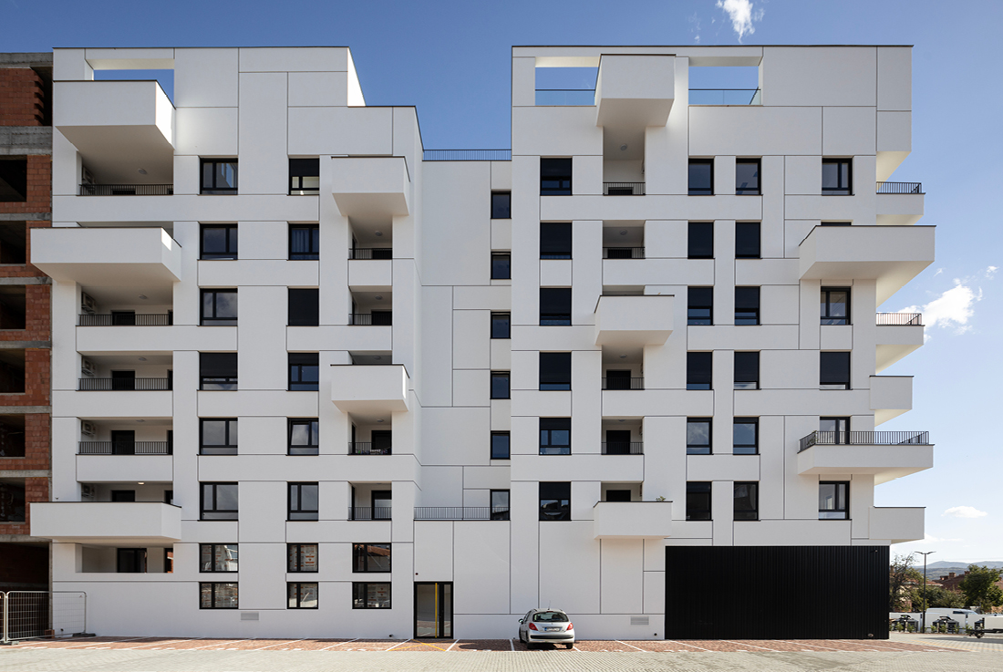 Ono što zgradu u niškom naselju Pantelej čini privlačnom jeste njena razuđena fasada koja je, zahvaljujući pravilnom rasteru kvadrata i pravougaonika – nalik slaganju u Tetrisu – dobila efektan izgled koji je u isto vreme i sveden. Ceo tekst ovde