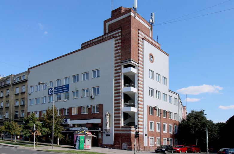 Ugaoni objekat dvojne materijalizacije – opeke i bele teranove – na raskrsnici Bulevara Mihajla Pupina i Sonje Marinković, takoreći na drugom proširenom punktu javnog prostora, sa naglašenom kulom i ugaonim prozorskim horizontalama na mestu vertikalne komunikacije, dodatno podržanim dvomaterijalnim i dvoteksturalnim horizontalnim produžecima, jednim prepoznatljivim i zaštitnim znakom moderne arhitekture, ali i ličnim autorskim pečatom, izveden je prema nacrtima uglednog, renomiranog i etabliranog arhitekte Dragiše Brašovana (1887–1965).