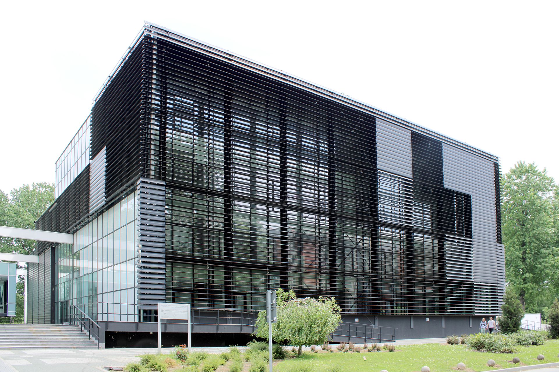 Jednostavni i kompaktni stakleni kubus dodatno je naglašen rešetkastom strukturom brise-soleila kao posebnom tananom i nonšalantnom sekundarnom fasadnom opnom.