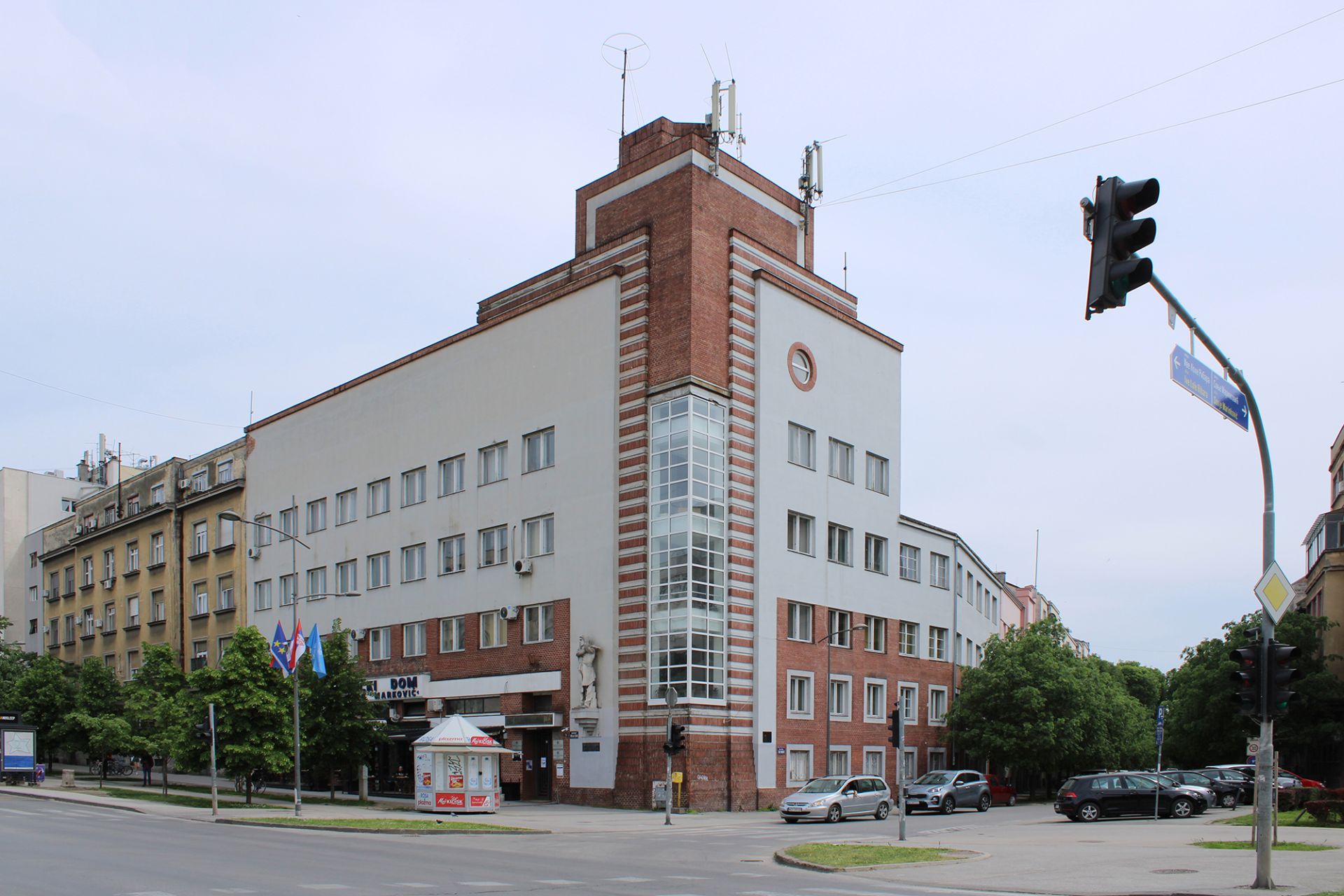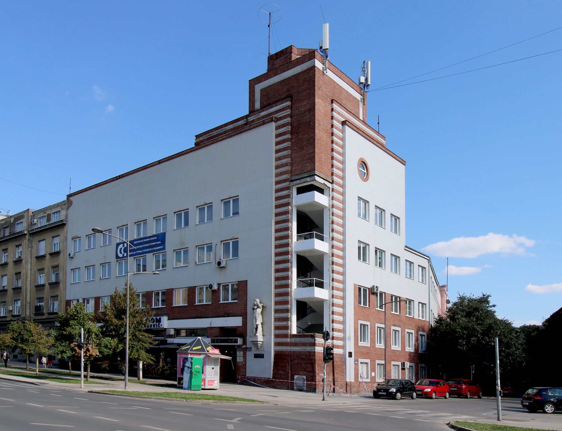 Ugaoni objekat dvojne materijalizacije – opeke i bele teranove – na raskrsnici Bulevara Mihajla Pupina i Sonje Marinković, takoreći na drugom proširenom punktu javnog prostora, sa naglašenom kulom i ugaonim prozorskim horizontalama na mestu vertikalne komunikacije, dodatno podržanim dvomaterijalnim i dvoteksturalnim horizontalnim produžecima, jednim prepoznatljivim i zaštitnim znakom moderne arhitekture, ali i ličnim autorskim pečatom, izveden je prema nacrtima uglednog, renomiranog i etabliranog arhitekte Dragiše Brašovana (1887–1965).