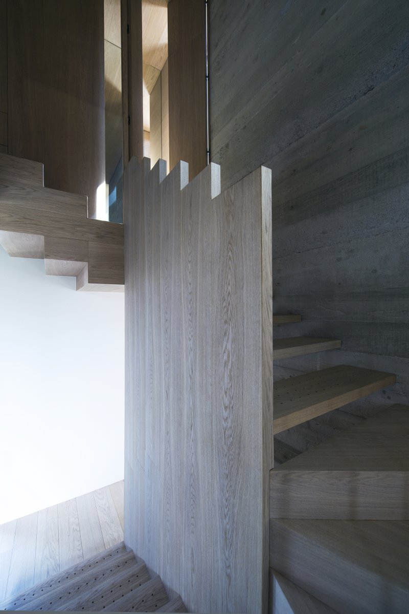 U delu ukrštanja volumena napravljena je veza u vidu stepenica okačenih o glavni betonski zid. Inspiracija za ovo stepenište potekla je od rešenja čuvenog arhitekte Adolfa Losa koji je osmišljavao enterijere s puno platformi, niša i skrivenih kutaka. Upravo ovo stepenište obloženo u drvo čini srce kuće.