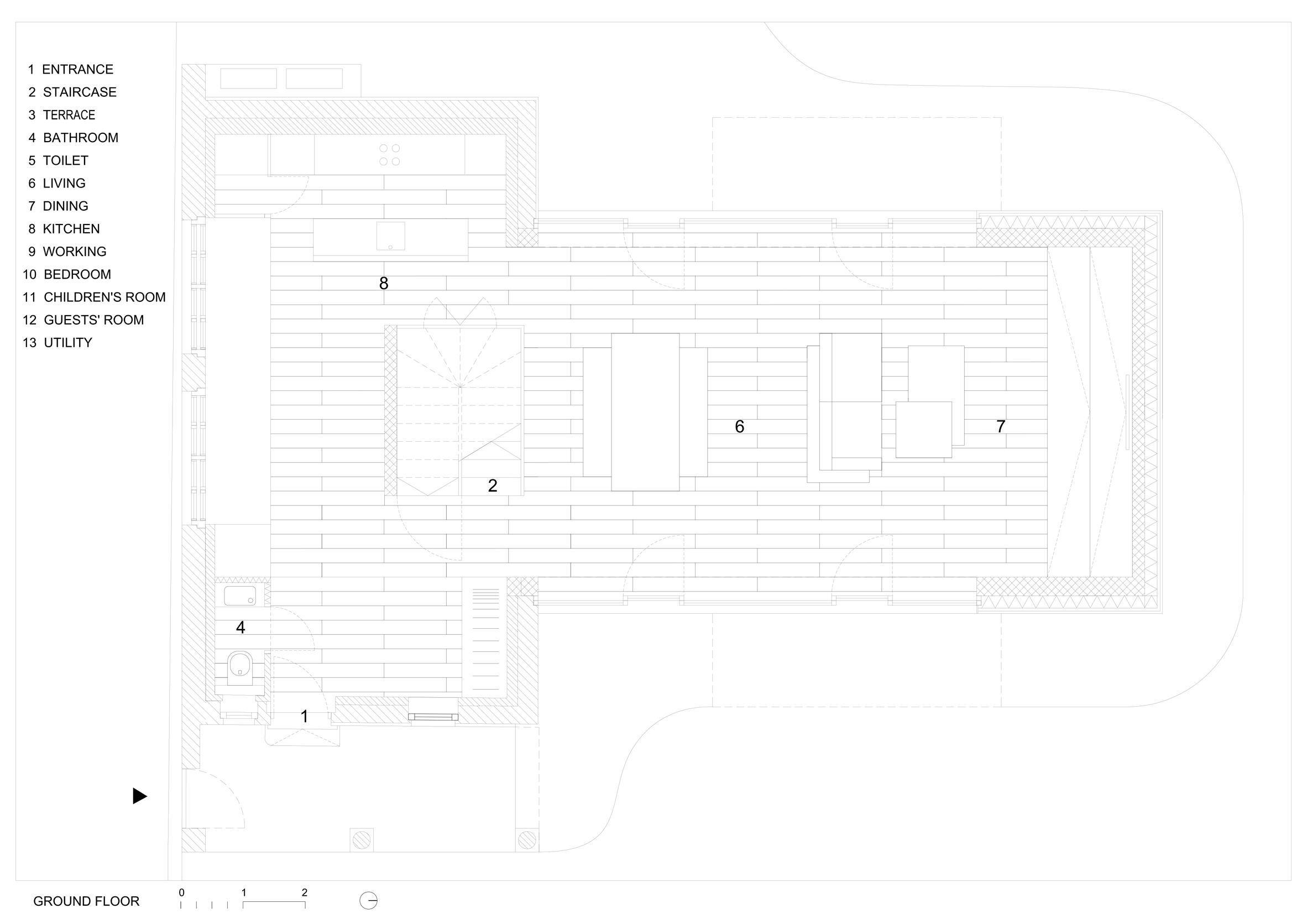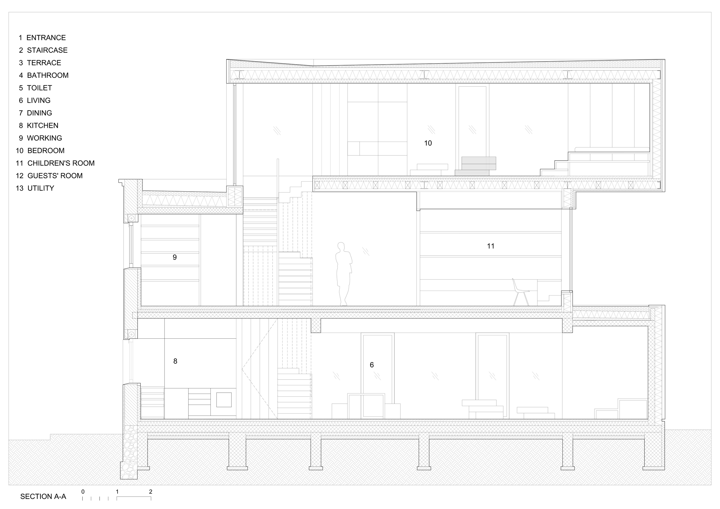 Stari i novi deo kuće povezan je na više načina: ekstenzija probija kroz zidove stare kuće čime su kreirani različiti prostori: dnevni boravak na prizemlju, dečija i gostinska soba na prvom spratu, spavaća soba s boravkom na drugom spratu.