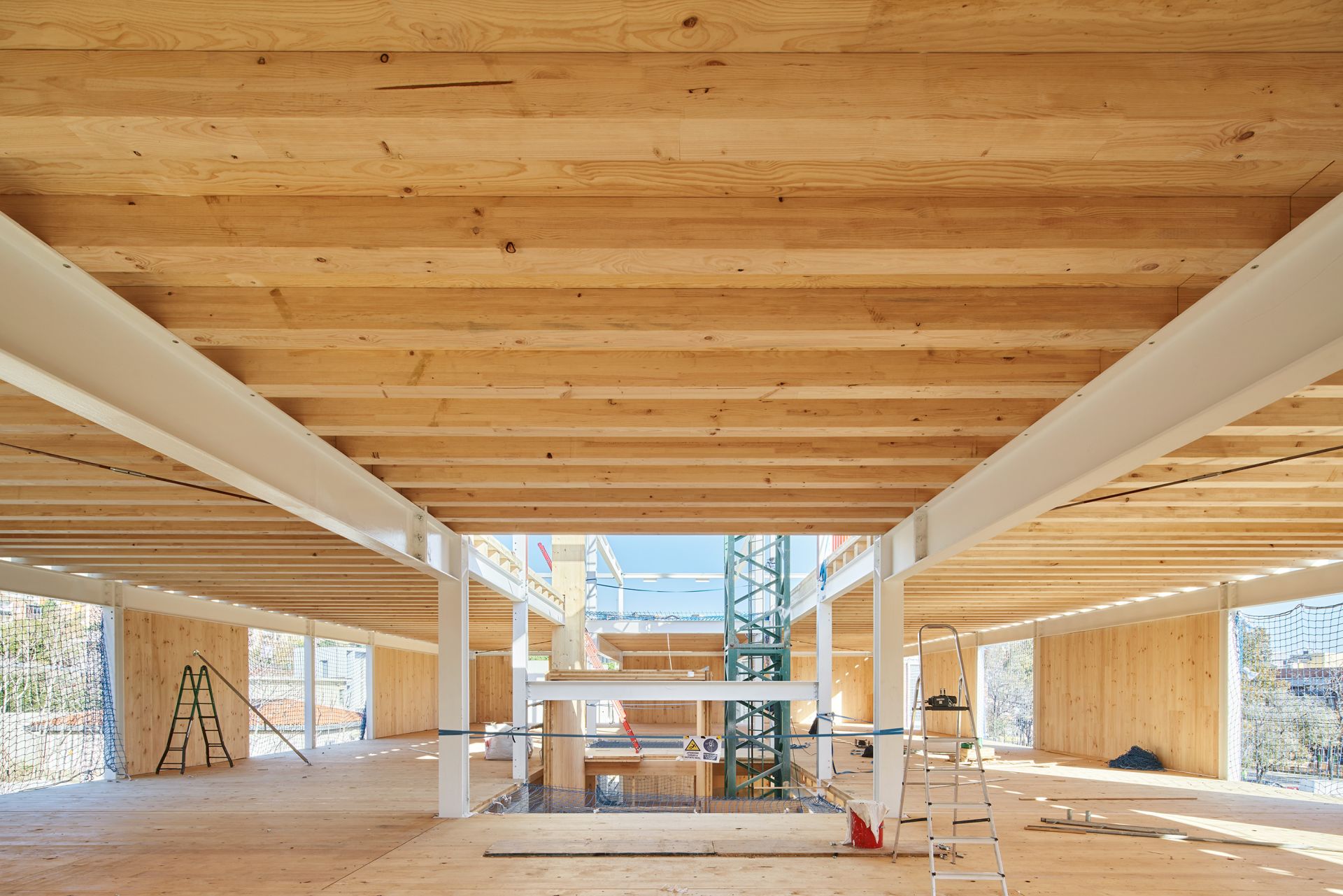 Metalni okvir nosača i stubova postavljen je u kombinaciji s nosivim sistemom od unakrsno lameliranih drvenih panela i plafona.