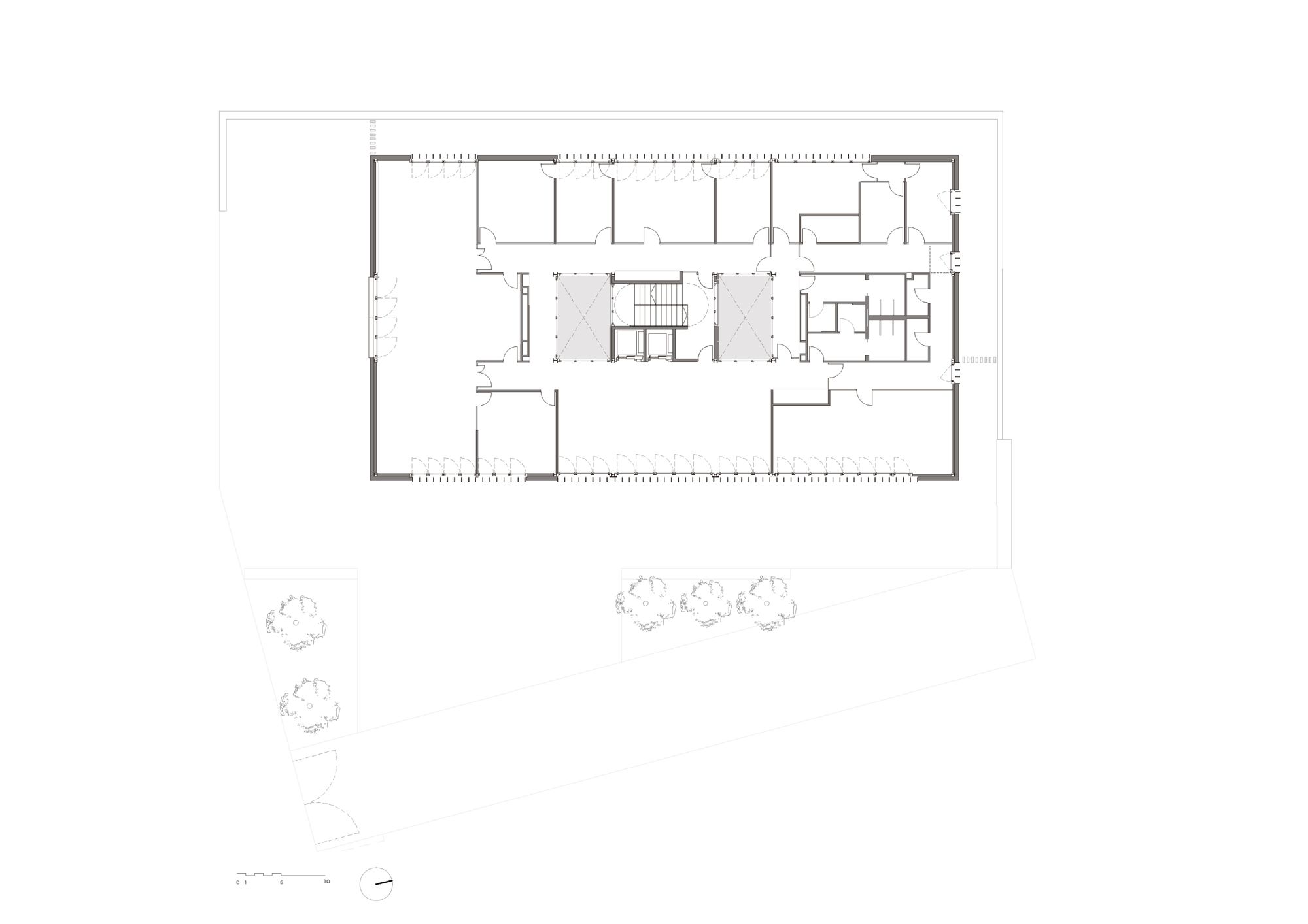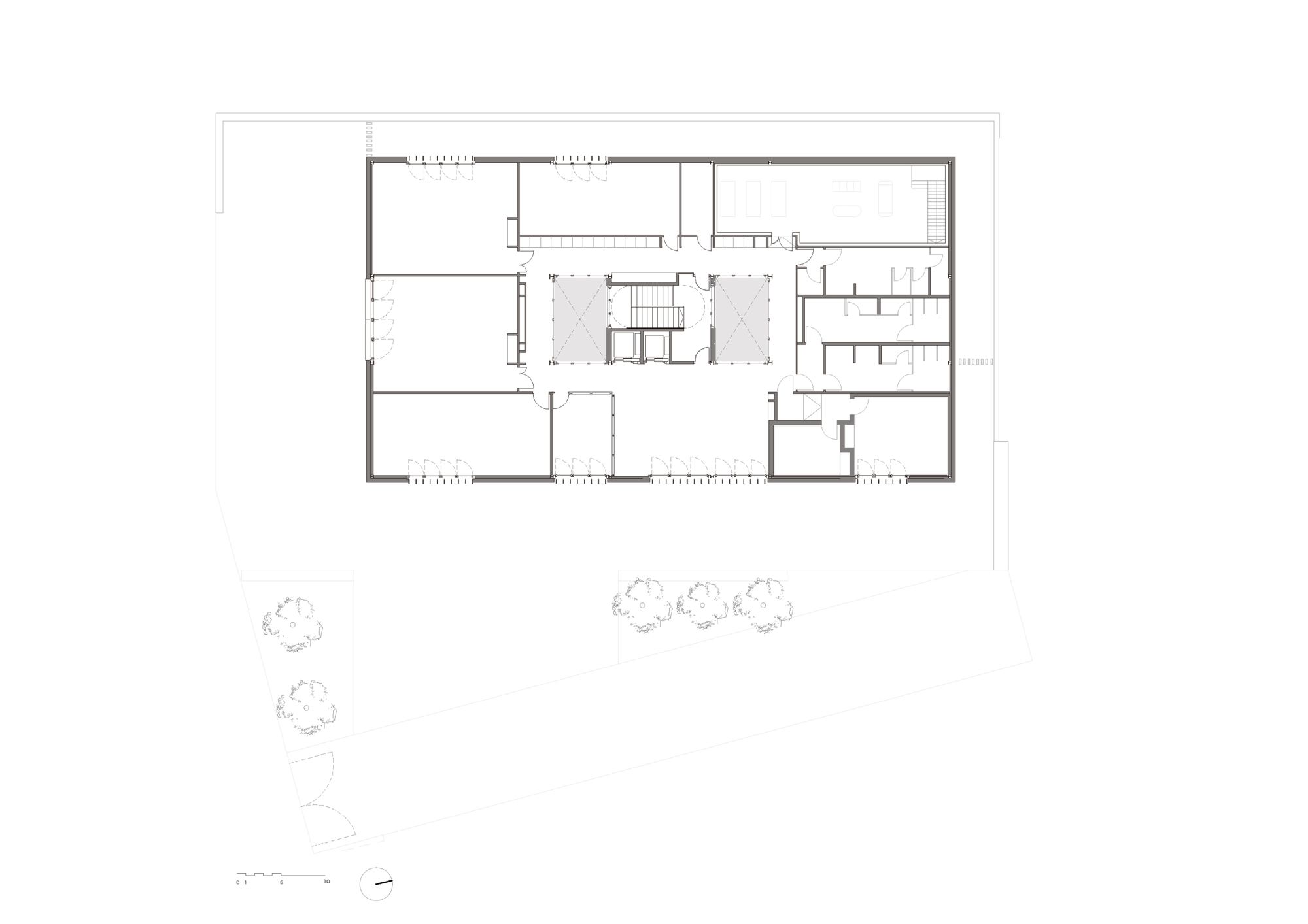 Na četiri etaže smeštene su kancelarije i prostori za lokalna udruženja postavljeni oko centralne osovine.