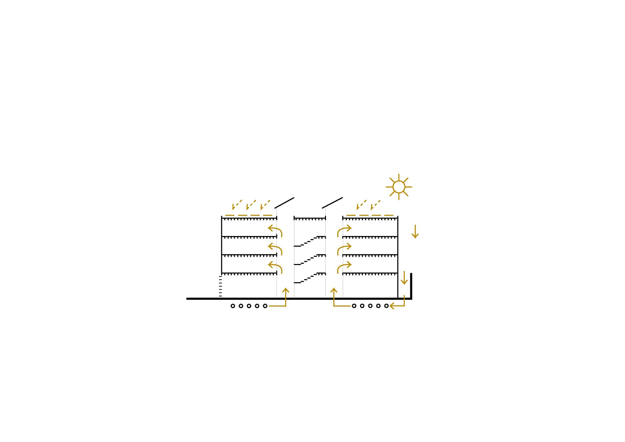 Izvučen iz zemlje, vazduh koji cirkuliše kroz cevi se greje i pušta u dva natkrivena dvorišta koja funkcionišu kao veliki provodnici. Takav vazduh je hladan leti a topao zimi, što predstavljam omaž autora staroj tradiciji mediteranske gradnje.