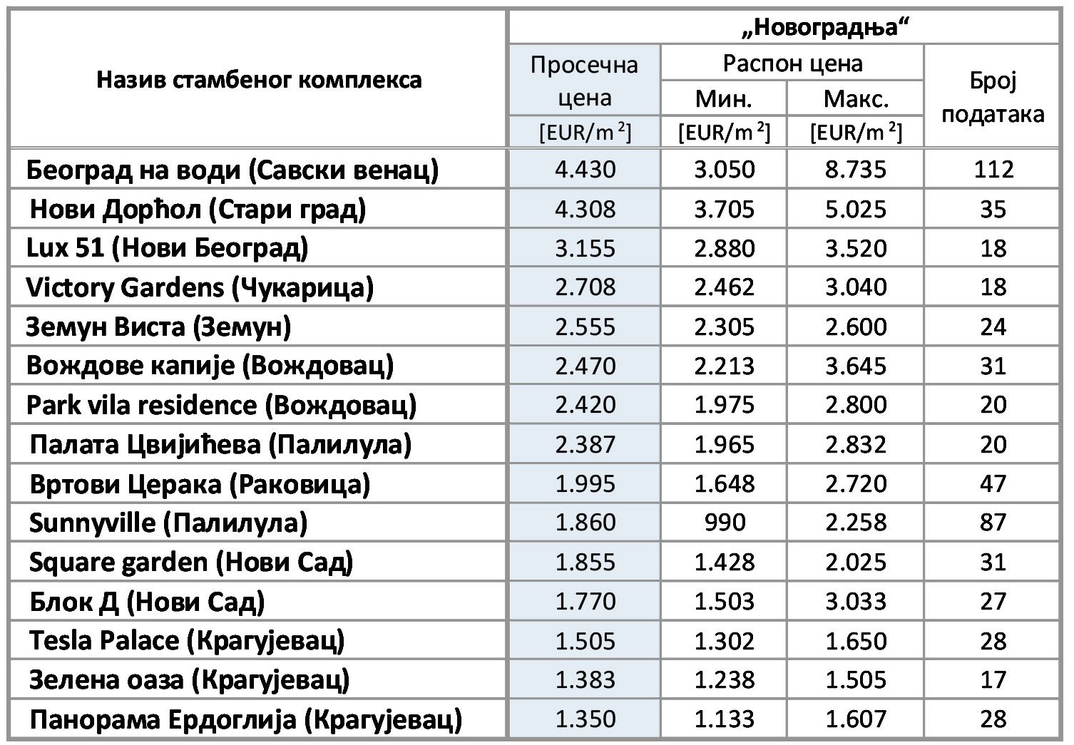 U novijim stambenim kompleksima u četvrtom kvartalu 2023. godine prosečne cene prometovanih stanova kretale su se od 1.350 EUR/m² u Kragujevcu do 4.430 EUR/m² u naselju Beograd na vodi, gde je zabeležena maksimalna cena kvadrata od 8.735 evra.