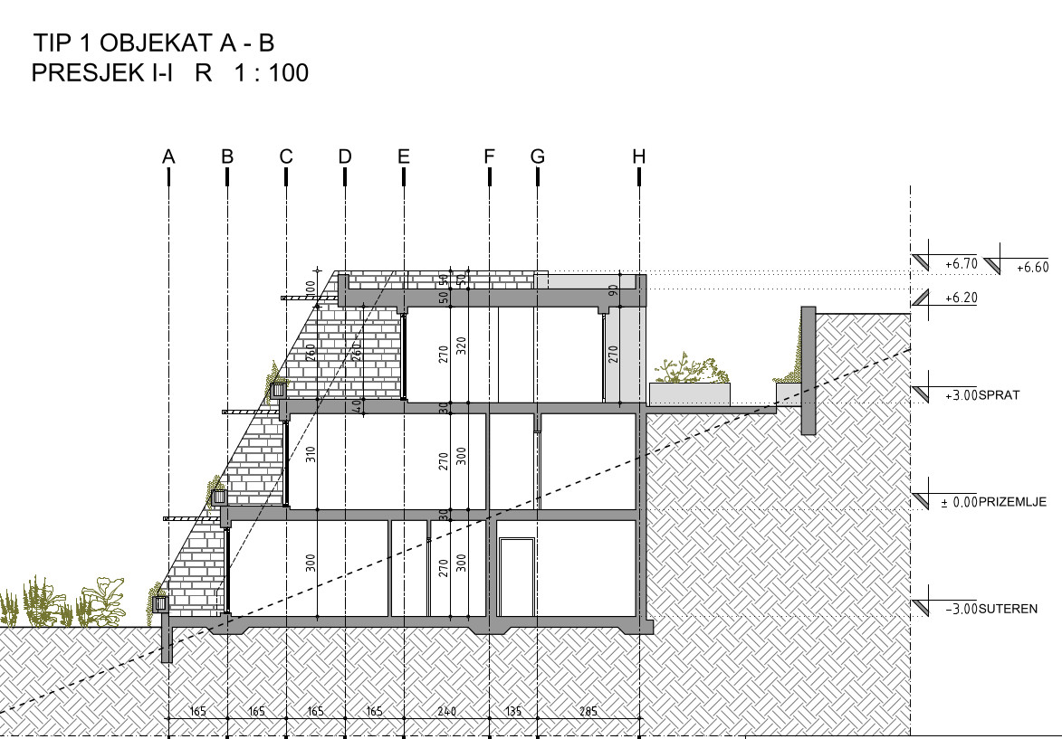 Zadnja strana objekata je na nivou suterena i prizemlja potpuno ukopana, i ukazuje se iznad terena samo kao jednostavna, malterisana fasada poslednje etaže (sprata).