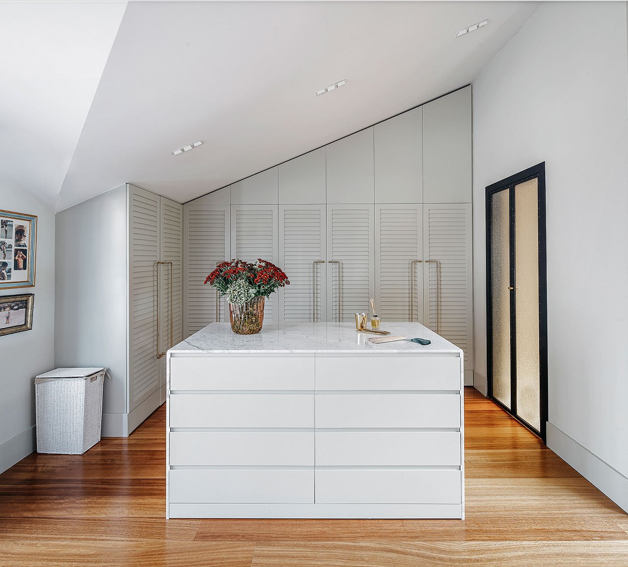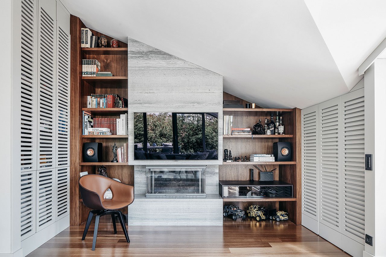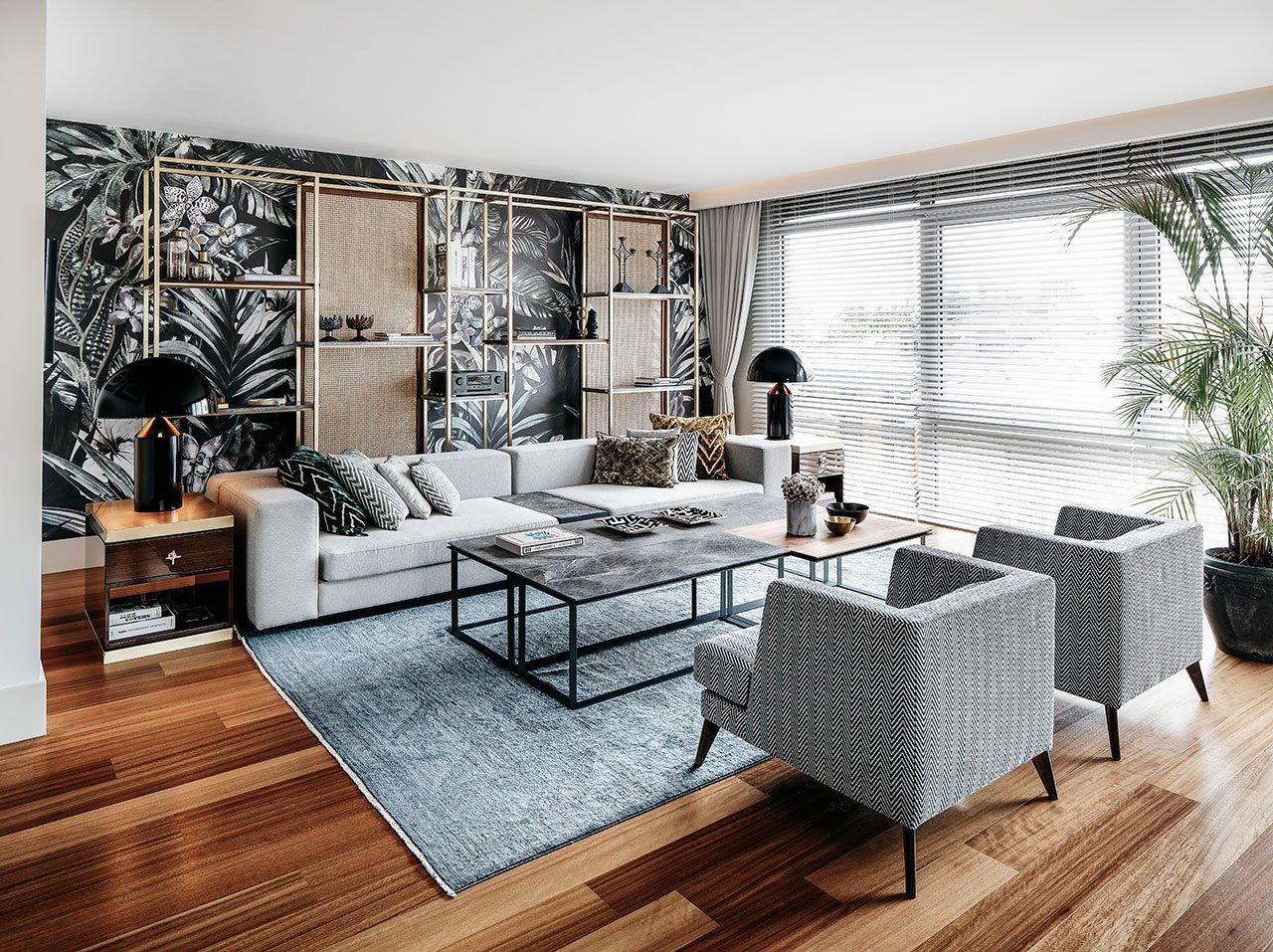 Ispred tapete postavljena je polica u duhu pedesetih godina prošlog veka koja je takođe rađena po meri. Preko linijskih nosača od mesinga, postavljene se mermerne ploče koje su ugostile raskošne vaze i dominantne stone lampe u crnoj boji – potpuno u duhu italijanskih enterijera ali se i dalje oseća prisustvo Orijenta. To je ta mešavina stilova koja je tako privlačna!