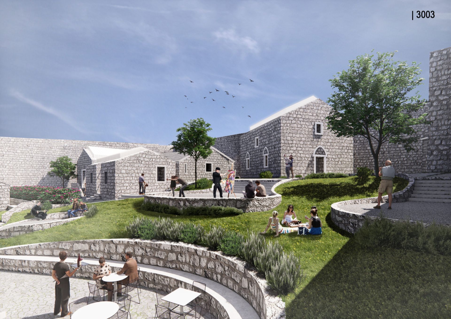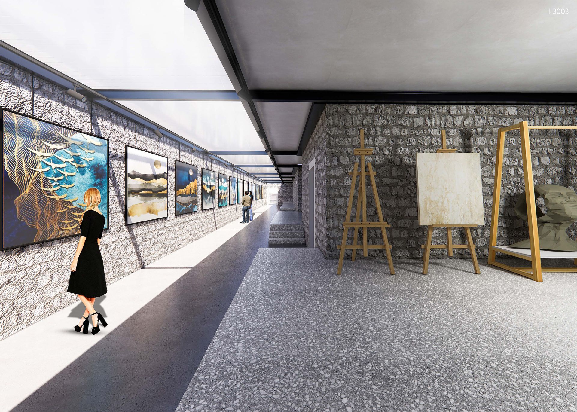 Umetnički pristup dizajnu komunikacionih i slobodnih prostora unutar kompleksa, nagoveštavajući savremenu interpretaciju tradicionalnog gumna, stvara izolovane oblasti za rad umetnika na otvorenom.