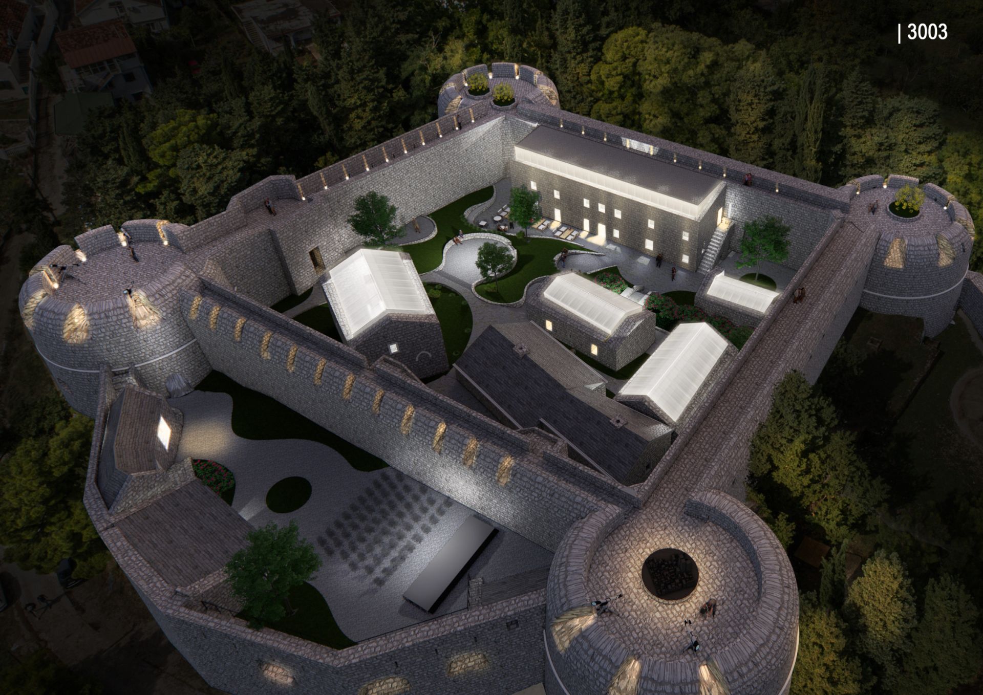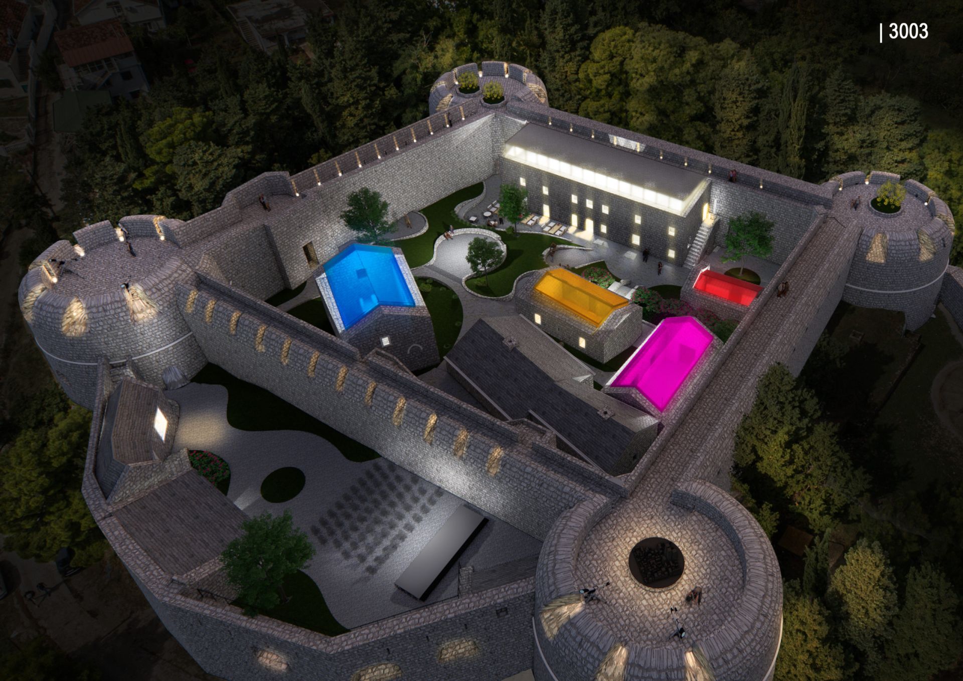 Tokom noći, uz integrisani LED sistem ili uz pomoć standardnih svetlosnih tela, polikarbonat sija u različitim bojama, što omogućava spektakularnu umetničku sliku samog kompleksa, a kada se održavaju različite kulturne manifestacije, sjaj struktura bi doprineo stvaranju nadrealne scene unutar tvrđave.