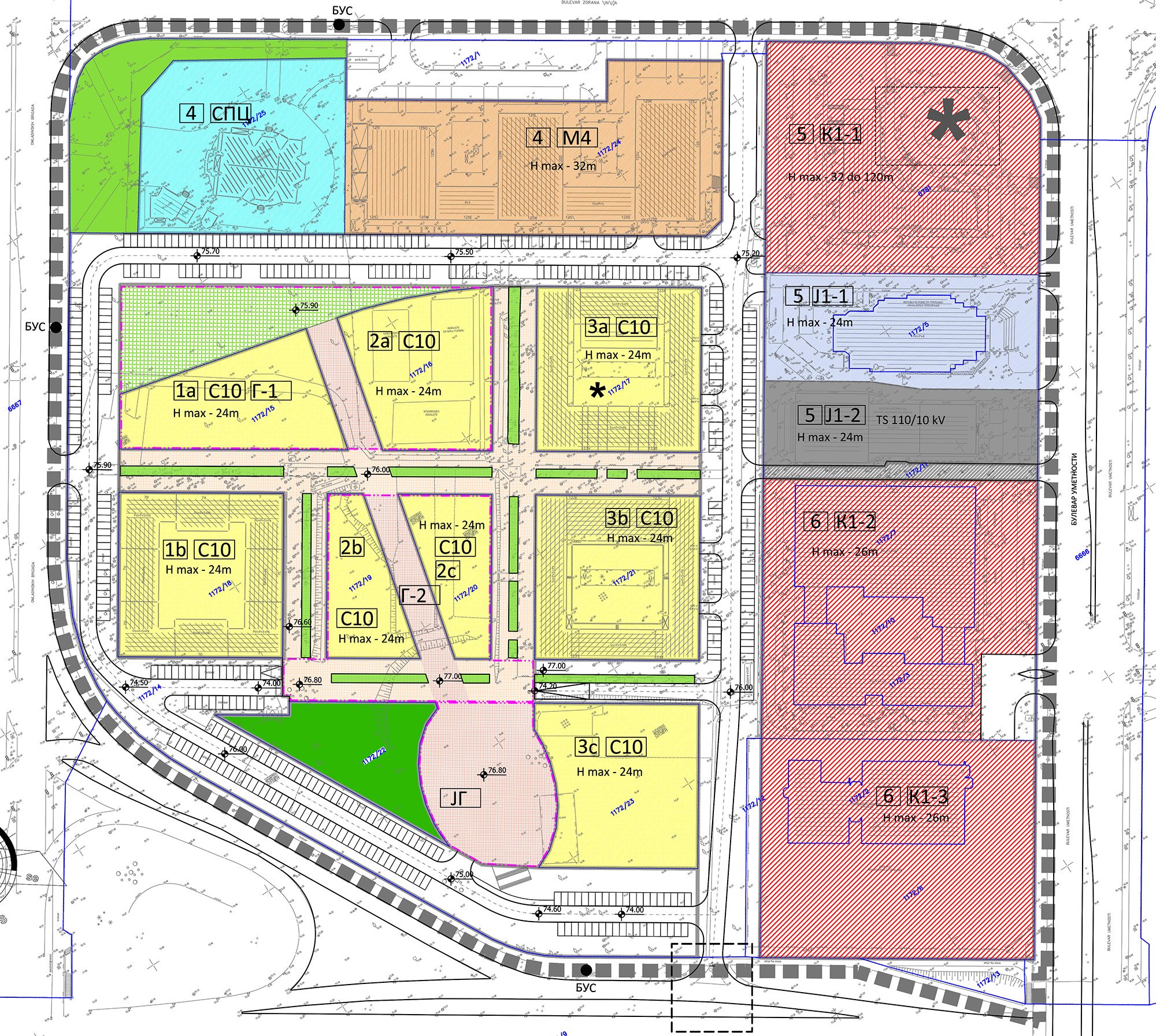 Pored ovoga, planira se povećanje zone stanovanja objektima maksimalne visine do 24m, formiranje komercijalne zone sa objektima visine do 26m, i zone mešovitih gradskih centara maksimalne visine objekata do 32 metra. Ostali objekti zatečeni na lokaciji, kao što su PIO fond, objekat Telekoma Srbije kao i diplomatsko predstavništvo Slovačke Republike se zadržavaju.