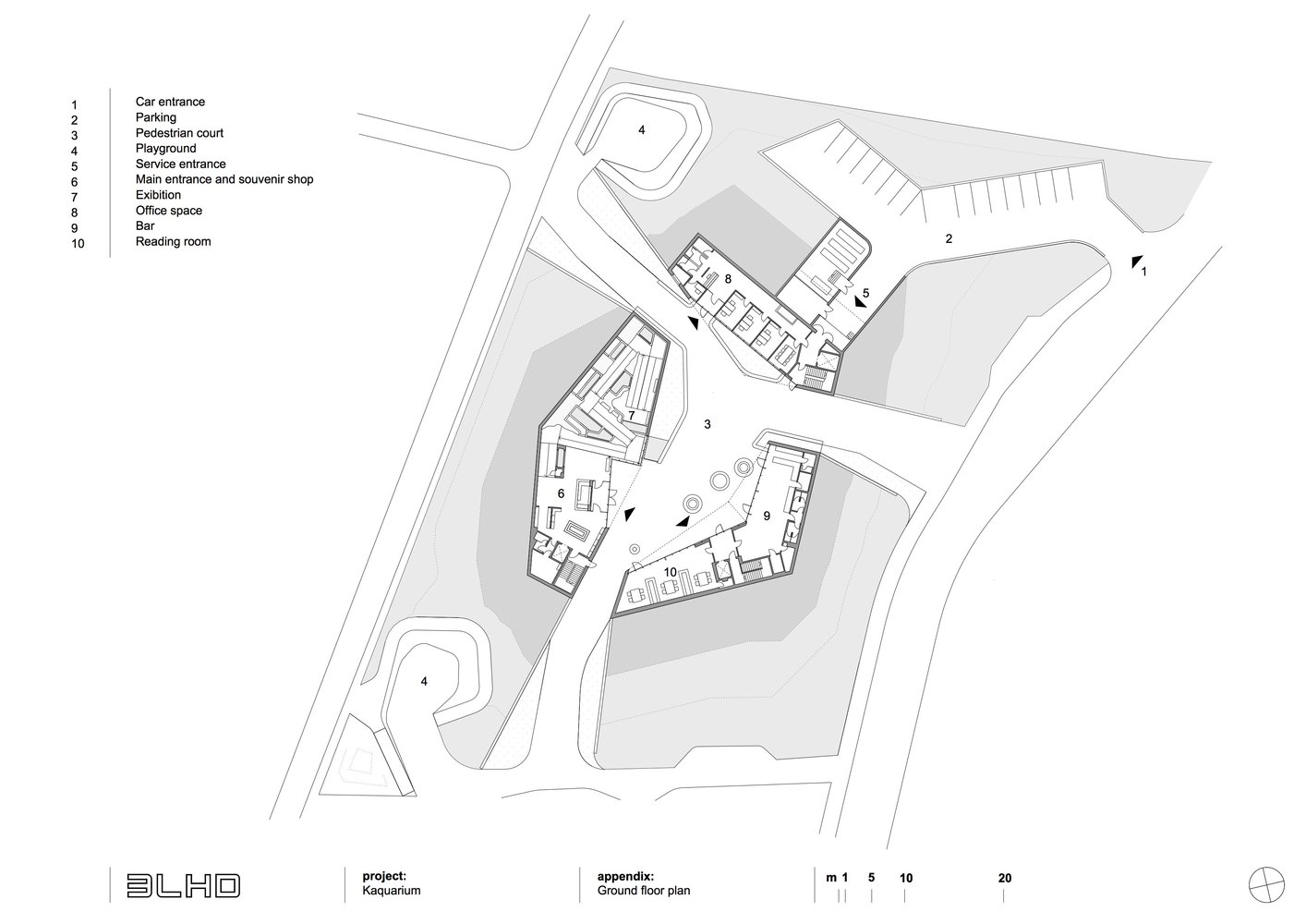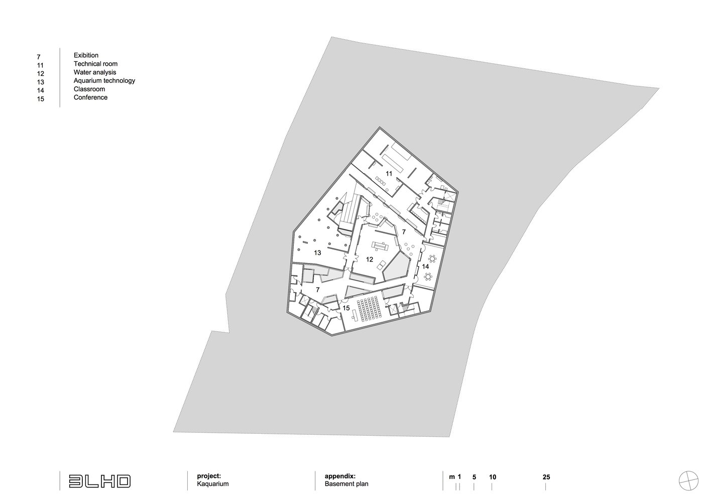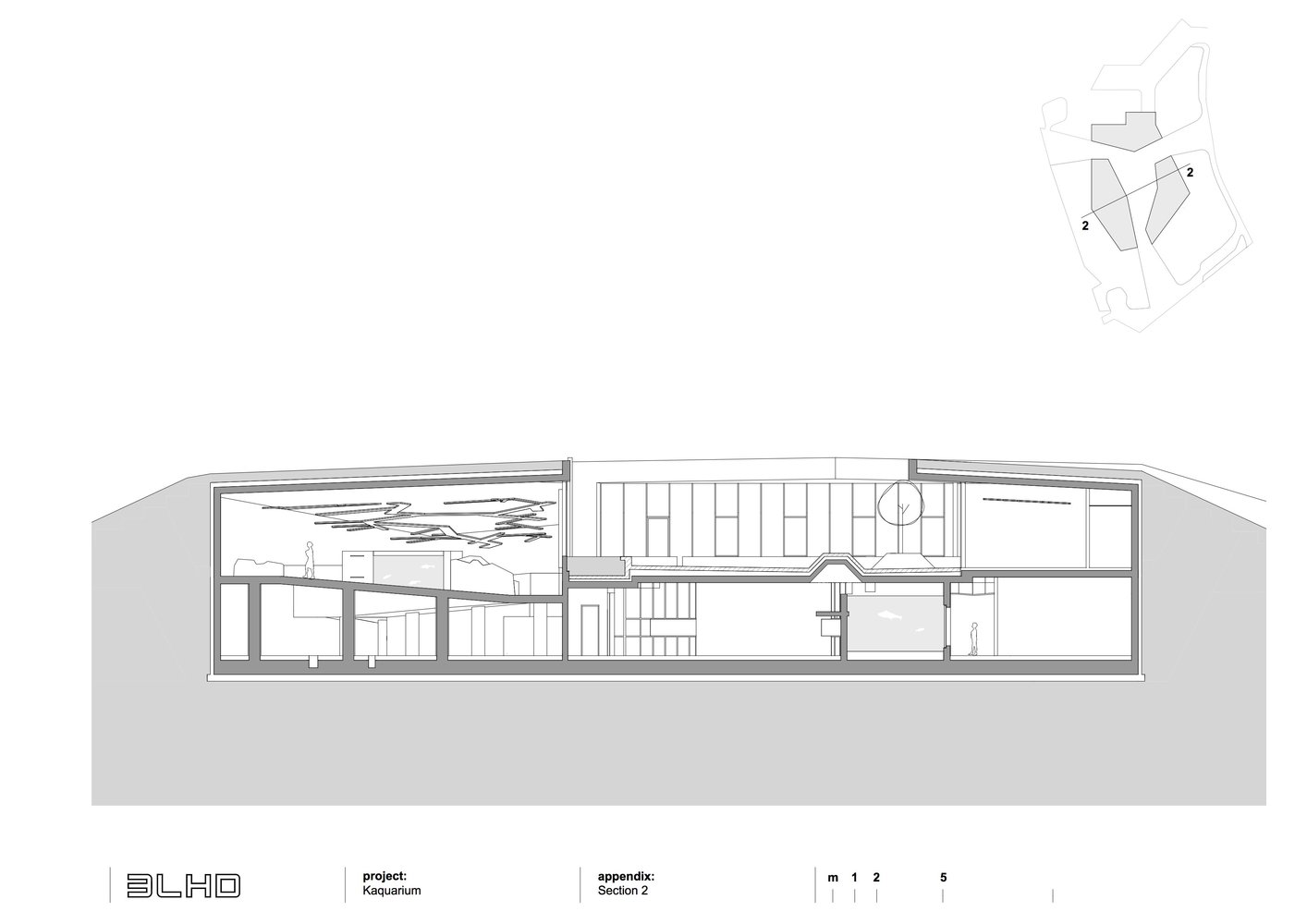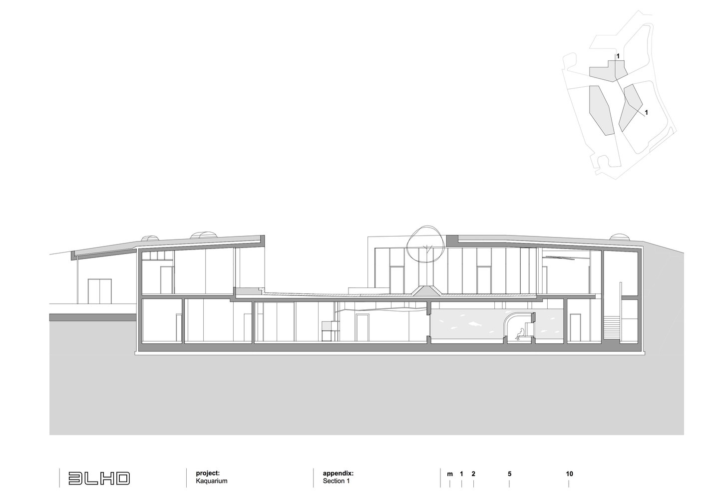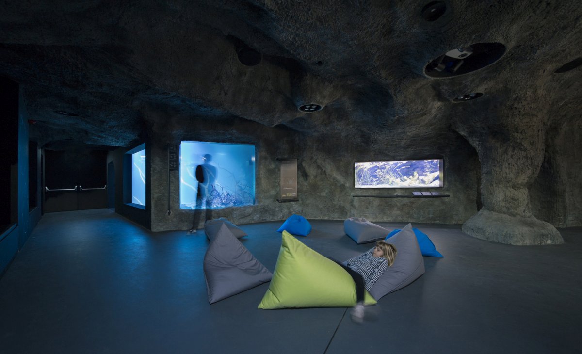 Akvarijum počinje na trgu a zatim se u objektu pomoću rampe, koja vijuga kao reka, spušta u podrumsku etažu.