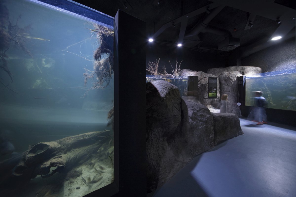 Nakon pećine, posetioci dolaze pred akvarijum s većim primercima retkih vrsta koje su iščezle iz hrvatskih staništa, a prikazana reka simbolički izvire ponovo u svom donjem toku. Vide se ribe zajedno s vodenim biljem koje žive u toplijim delovima reke. Nakon prolaska kroz tunel posetioci prolaze kroz akvarijuma s lopočima i šašem kao što je to u donjem toku reke, u močvarnim staništima. Kraj izložbe sastoji se od sistema nekoliko akvarijuma koji se prelivaju jedan u drugi a čiji biotop prikazuje slapove i sedrenu barijeru.