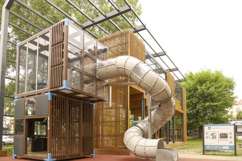 Igralište je izvedeno od prirodnih materijala, čelika i drveta. Čelik ima ulogu konstrukcije, a drvo je obloga i tačka kontakta sa korisnicima.