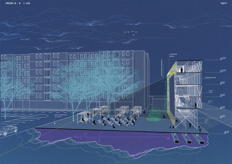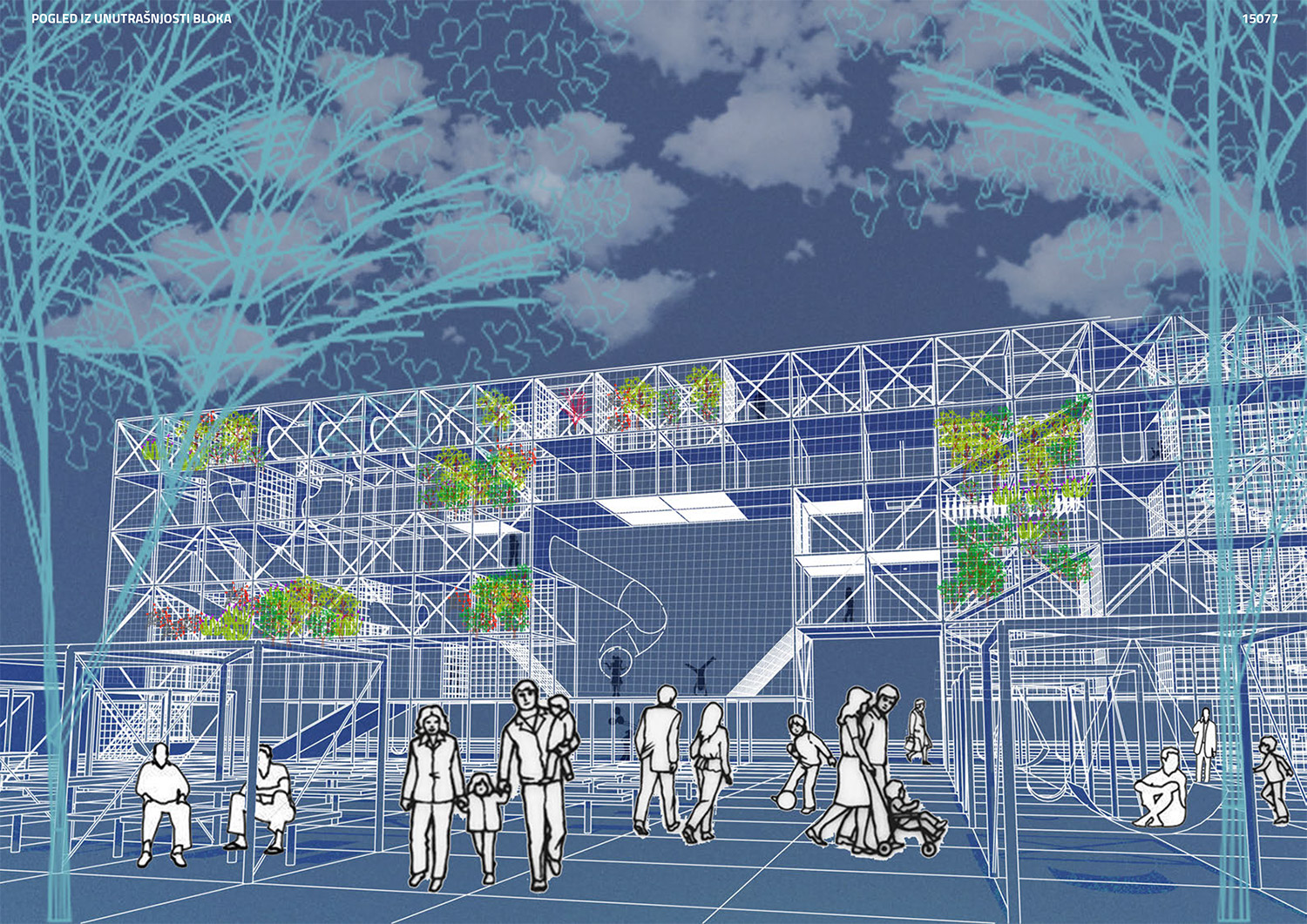 Projekat sa kojim su Jurić i Topić učestvovali na konkursu bilo je vertikalno igralište za decu, poput onih u tržnim centrima, ali na otvorenom i u volumenu velike linijske skele koja formira ambijentalnu celinu sa postojećim zelenim površinama u bloku.