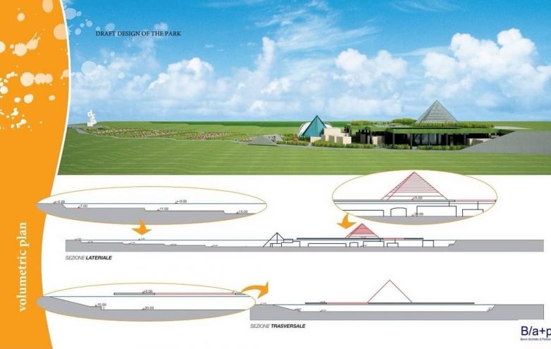 Na priloženim crtežima može se videti radna verzija idejnog rešenja sa piramidalnim rešenjem objekata okruženih vodenim površinama i zelenilom.