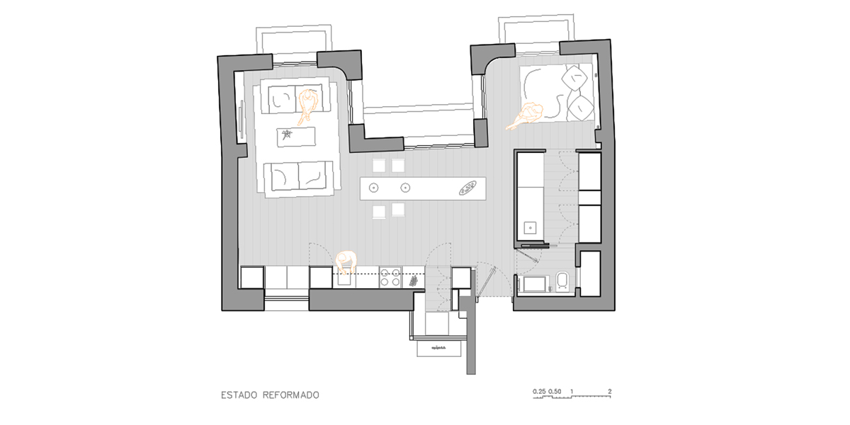 Stan smešten u najužem gradskom jezgu Barselone ima površinu od 50 metara kvadratnih, a želja vlasnice bila je da se izbegne klasičan plan organizacije prostora kao i da on bude što fleksibilniji.