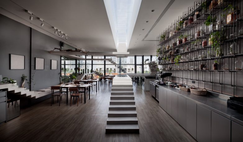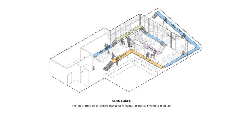 Čitava petlja stepeništa proteže se kroz ceo restoran, obavljajući različite funkcije, da bi poslednji krak vodio ka nebu, simbolično naglašavajući poruku koncepta “Idite negde.”
