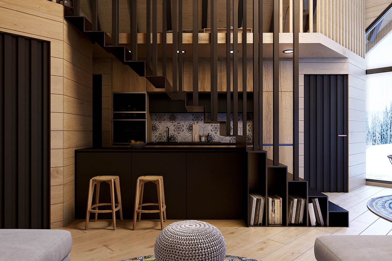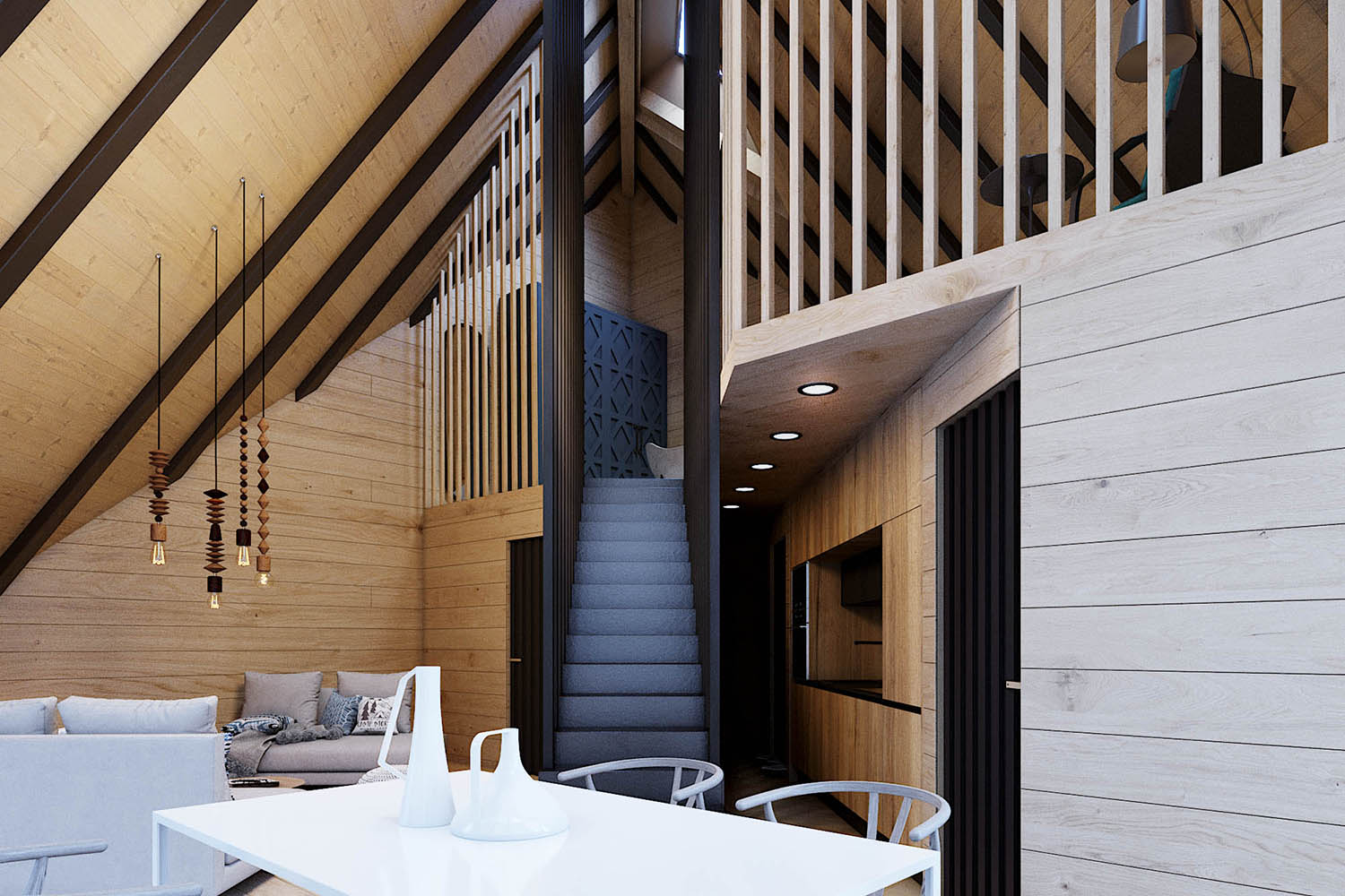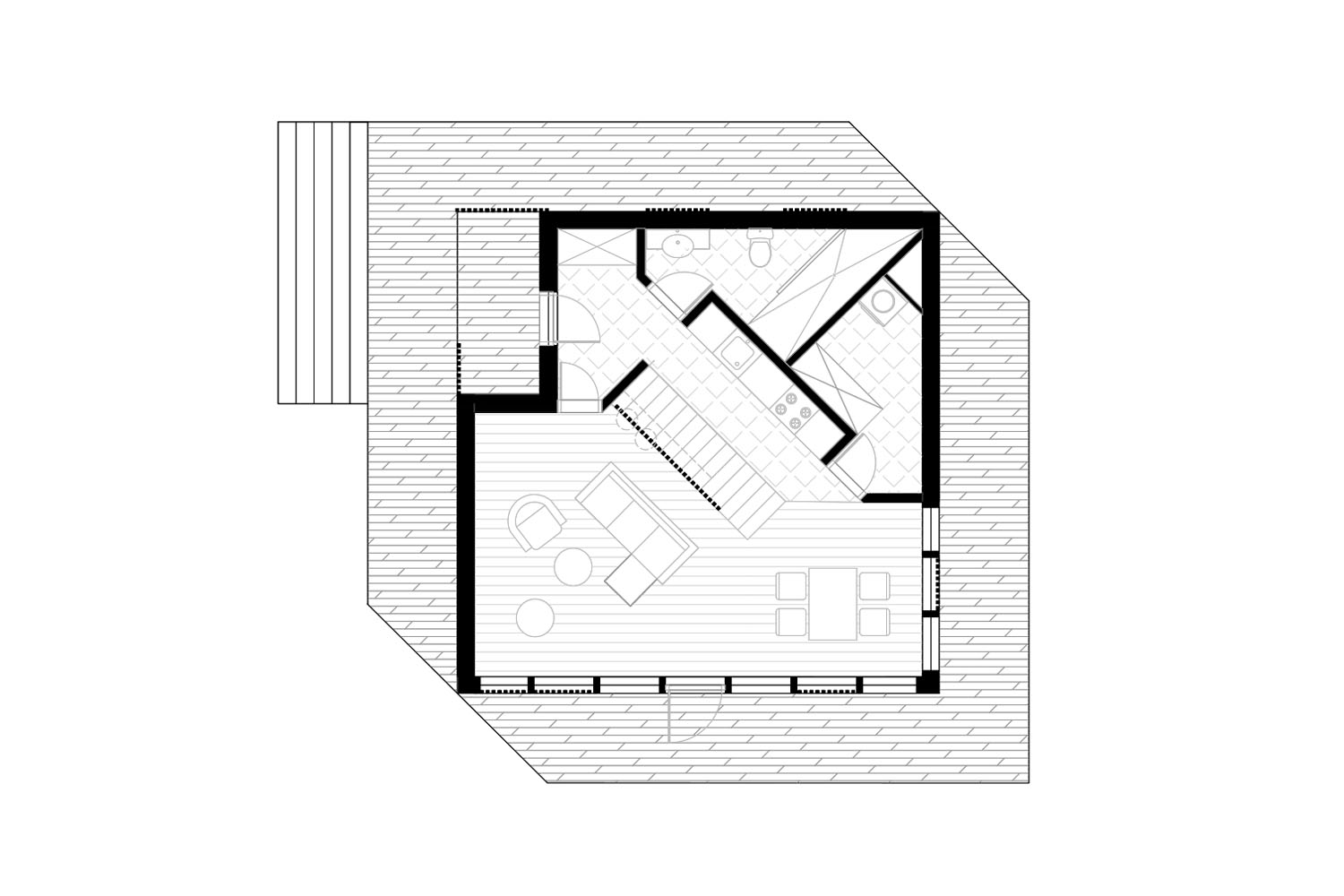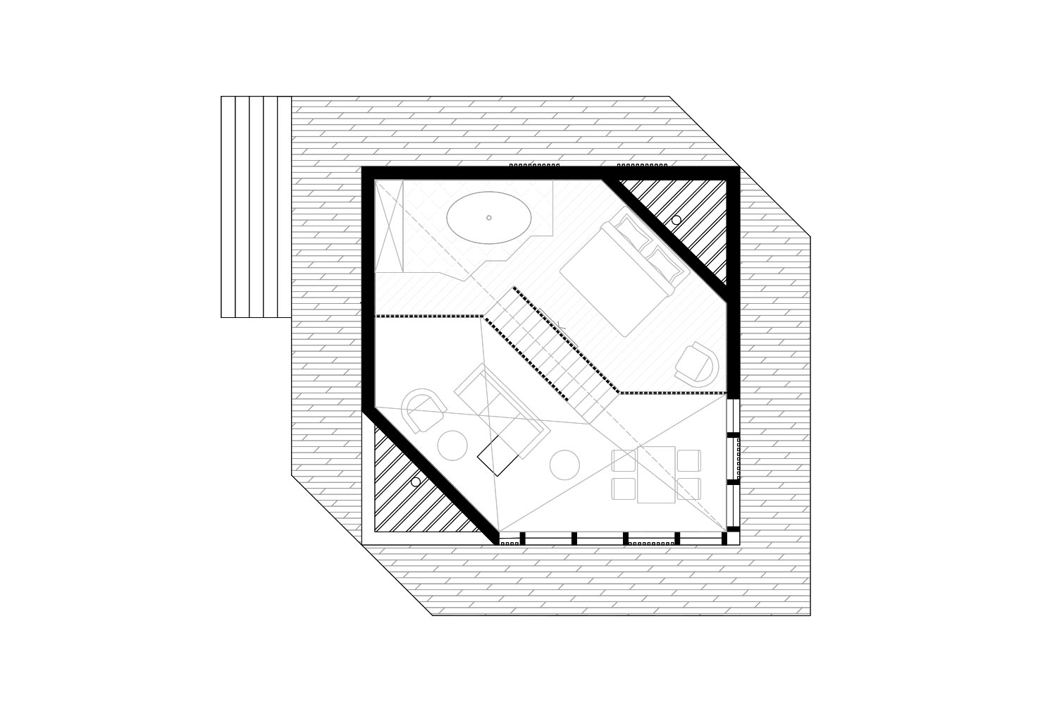Sadržaji na prizemlju se razvijaju po dijagonali. Središnji elementi orijentacije i organizacije su kuhinja i čelično stepenište koje povezuje prizemlje i galeriju.