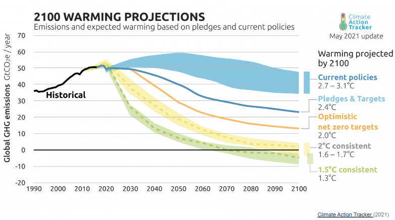 Da bi se povećanje temperature ograničilo na 1,5 ᵒC od predindustrijskog perioda neophodno je prepoloviti emisije CO₂ do 2030. godine te dostizanje nula emisija do 2070. godine (net-zero). Nažalost, realniji cilj bi bio da se do 2055. prepolovi emisija CO2, te povećanje temperature zaustavi na +2,0 ᵒC.