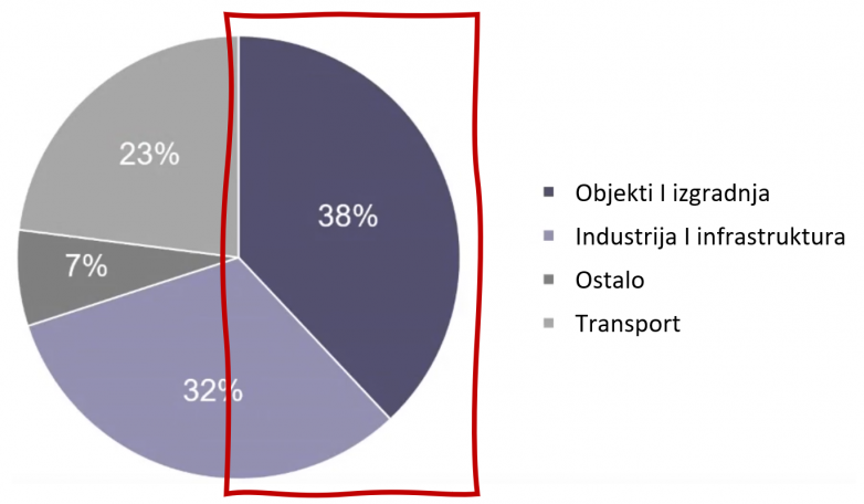 Da li je dovoljno samo „pojačati“ izolaciju i specifikaciju prozora i time smanjiti emisije? Na žalost, nije. Naime, upotreba objekta ima udeo od 10–25% u ukupnim emisijama CO₂ (videti grafikon iznad). Tačan procenat zavisi od tipa objekta, namene, klime i drugih faktora.