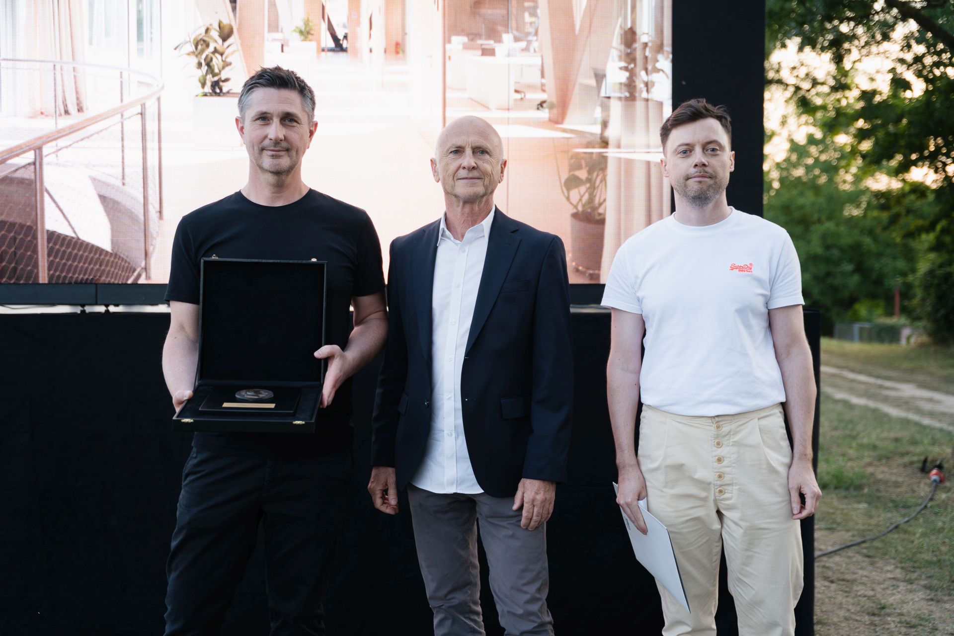 Dobitnik godišnje nagrade „Viktor Kovačić“ Marin Mikelić (Mikelić Vreš Arhitekti), Tomislav Petrinec iz Ministarstva kulture i medija Hrvatske, te Tomislav Soldo – član žirija |  Foto; Luka Dubroja