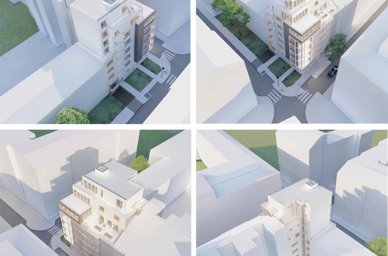 Arhitekte su projektovale markantni ugaoni objekat sa etažama koje se povlače prema unutrašnjosti parcele.