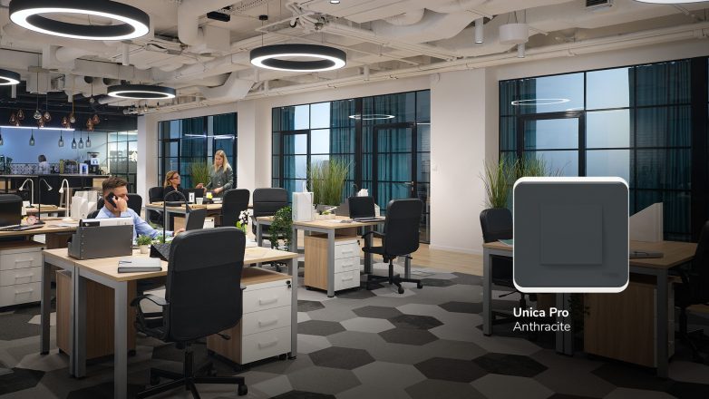 Okretni i tasteri za zatamnjenje, kompatibilni i sa konvencionalnim i sa LED osvetljenjem, pomažu da se lako prilagodi ambijentu. Pametna inovacija dizajna čini Unica asortiman lakim za instalaciju na zid, ali i na OptiLine45 parapete montažom „na klik“.