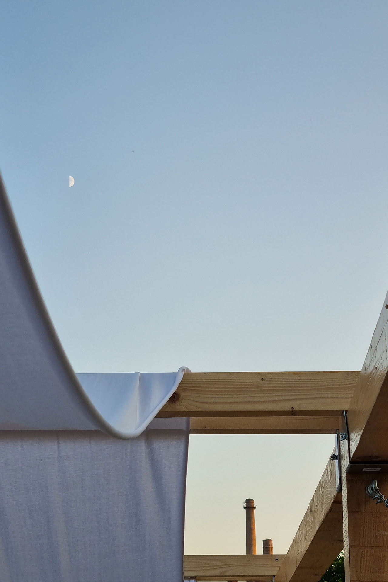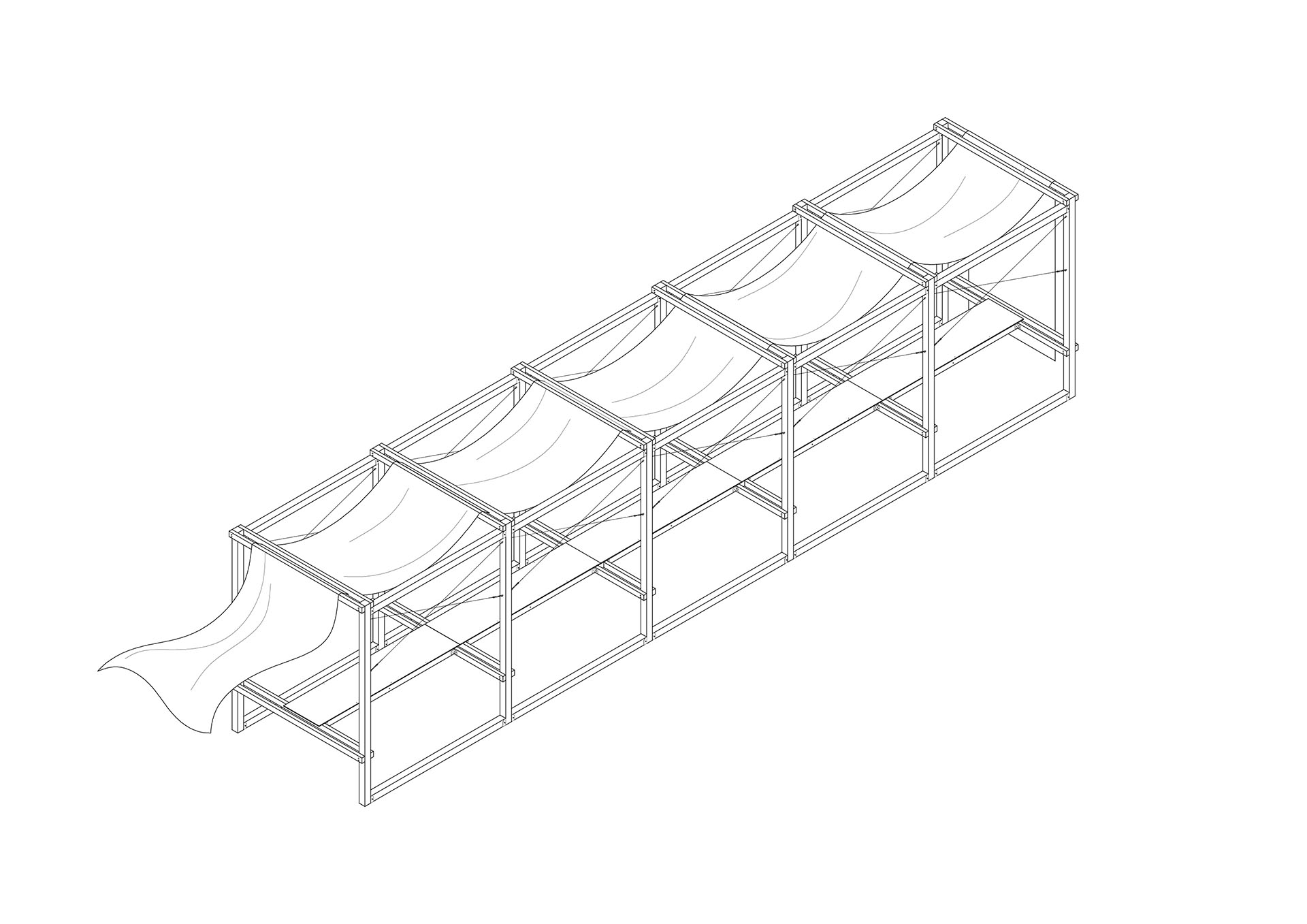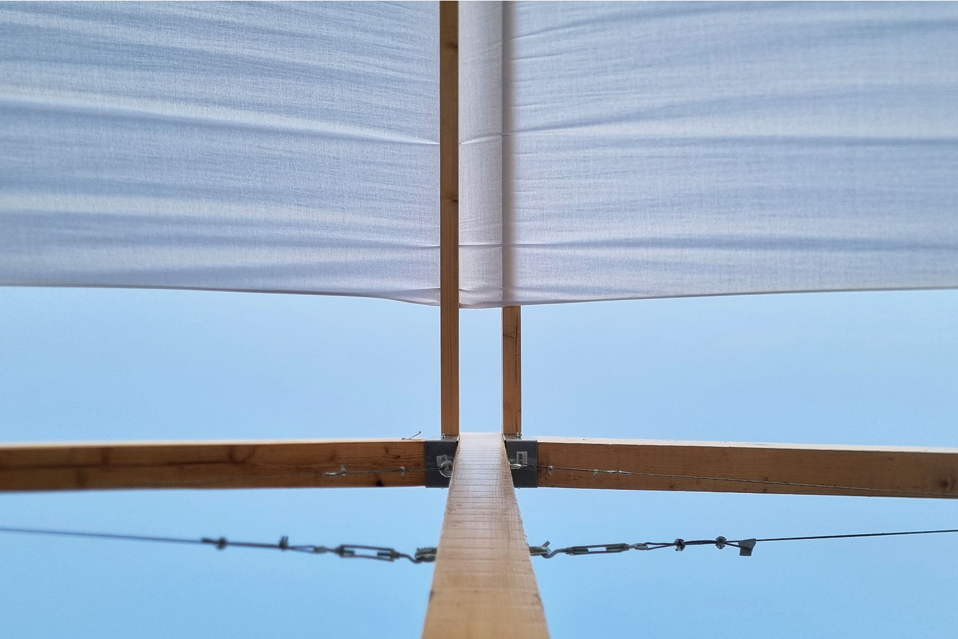 Fizionomija šatre se najdirektnije može opisati kroz vezu stola i šatora (razapetog platna). U slučaju paviljona, šator je glavni konstruktivni element prostorne strukture, i sačinjen je od šest drvenih modularnih ramova. Ramovi, međusobno povezani i ukrućeni drvenim gredama i zategama, nose stolove i laganu platnenu nadstrešnicu.
