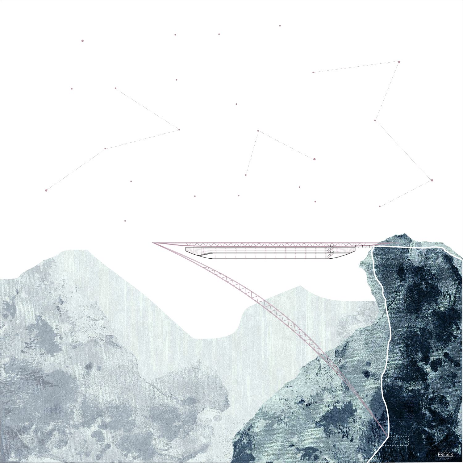 Tenzična pozicija objekta koji „visi“ sa litice dodatno je naglašena čeličnom prostornom rešetkom.