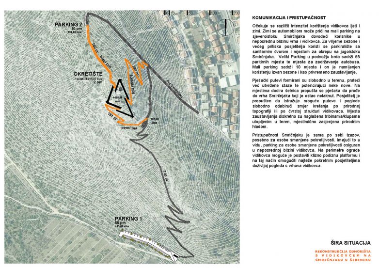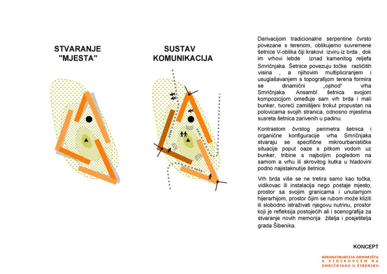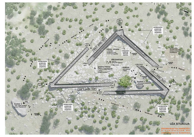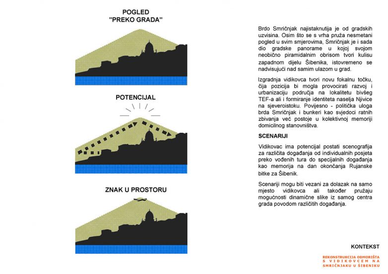 Prvonagrađeno rešenje izabrano je u sklopu projekta koje je Grad Šibenik sproveo u saradnji sa Arhitektonskim fakultetom u Zagrebu i Javnom ustanovom „Priroda“ Šibensko-kninske županije. Cilj projekta je valorizacija i uređenja prostora Smričnjak kao mesta od velikog kulturnog i istorijskog značaja. U formi malog pozivnog konkursa, idejna rešenja zatražena su od tri autorska tima: NFO, Arhitektonskog biroa Turato i tima MVA / Mikelić Vreš arhitekti.