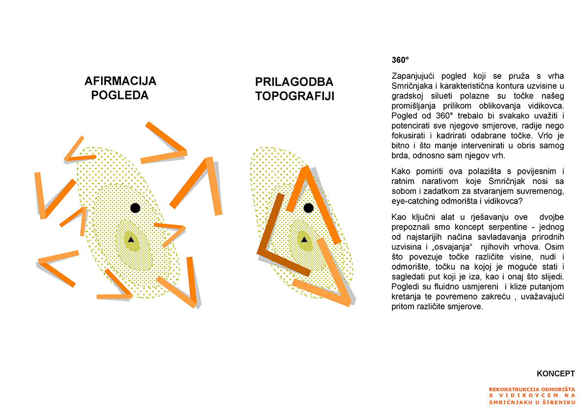 Spektakularni pogled koji se pruža sa vrha Smričnjaka i karakteristična kontura uzvišenja u gradskoj silueti polazne su tačke promišljanja prilikom oblikovanja vidikovca. Pogled od 360 stepena trebalo je uvažiti i naglasiti sve njegove pravce. Osim toga, jako je bilo važno što manje prostorno i građevinski narušiti karakter zatečenog terena i njegovu autentičnost.