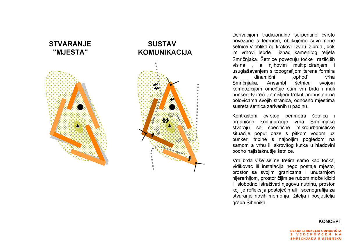 Kao ključno sredstvo u pomirivanju suprotstavljenih sila i zahteva zadatka odabran je koncept serpentina – jednog od najstarijih načina savladavanja prirodnih uzvišenja i „osvajanja“ njihovih vrhova. Osim što povezuje tačke različite nadmorske visine, serpentine nude i odmorište, tačku na kojoj je moguće stati i sagledati put koji je iza, kao i onaj koji tek predstoji.