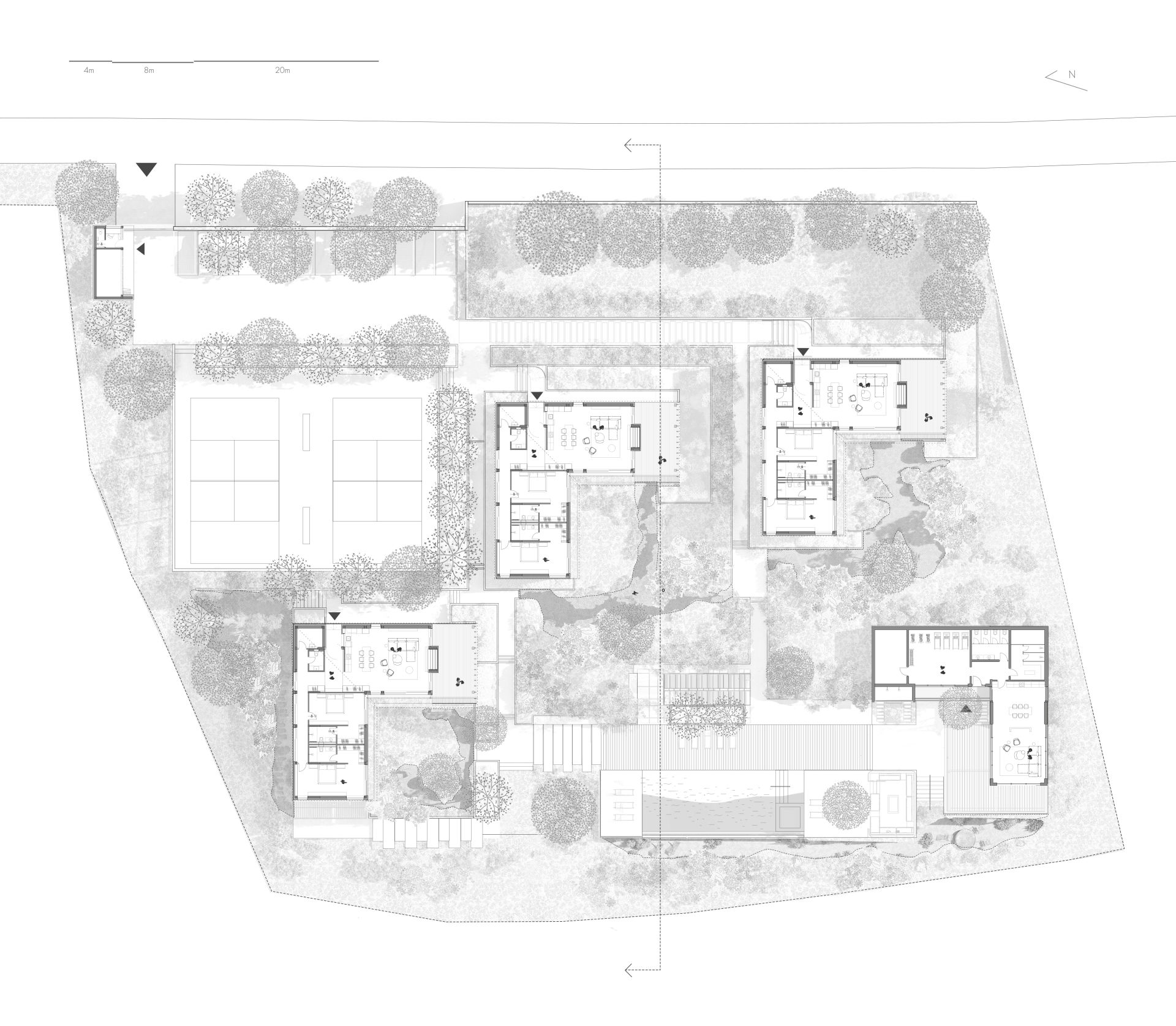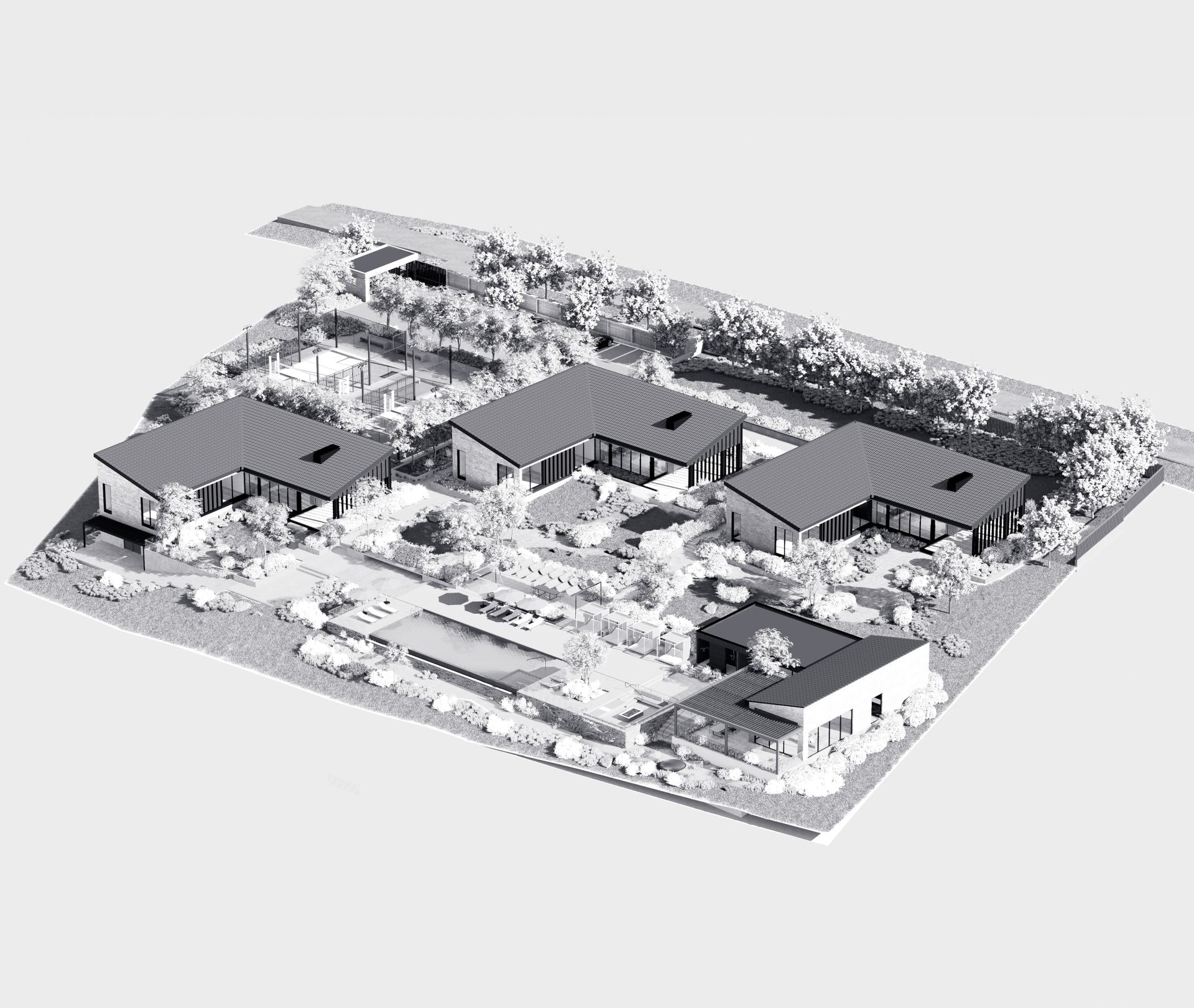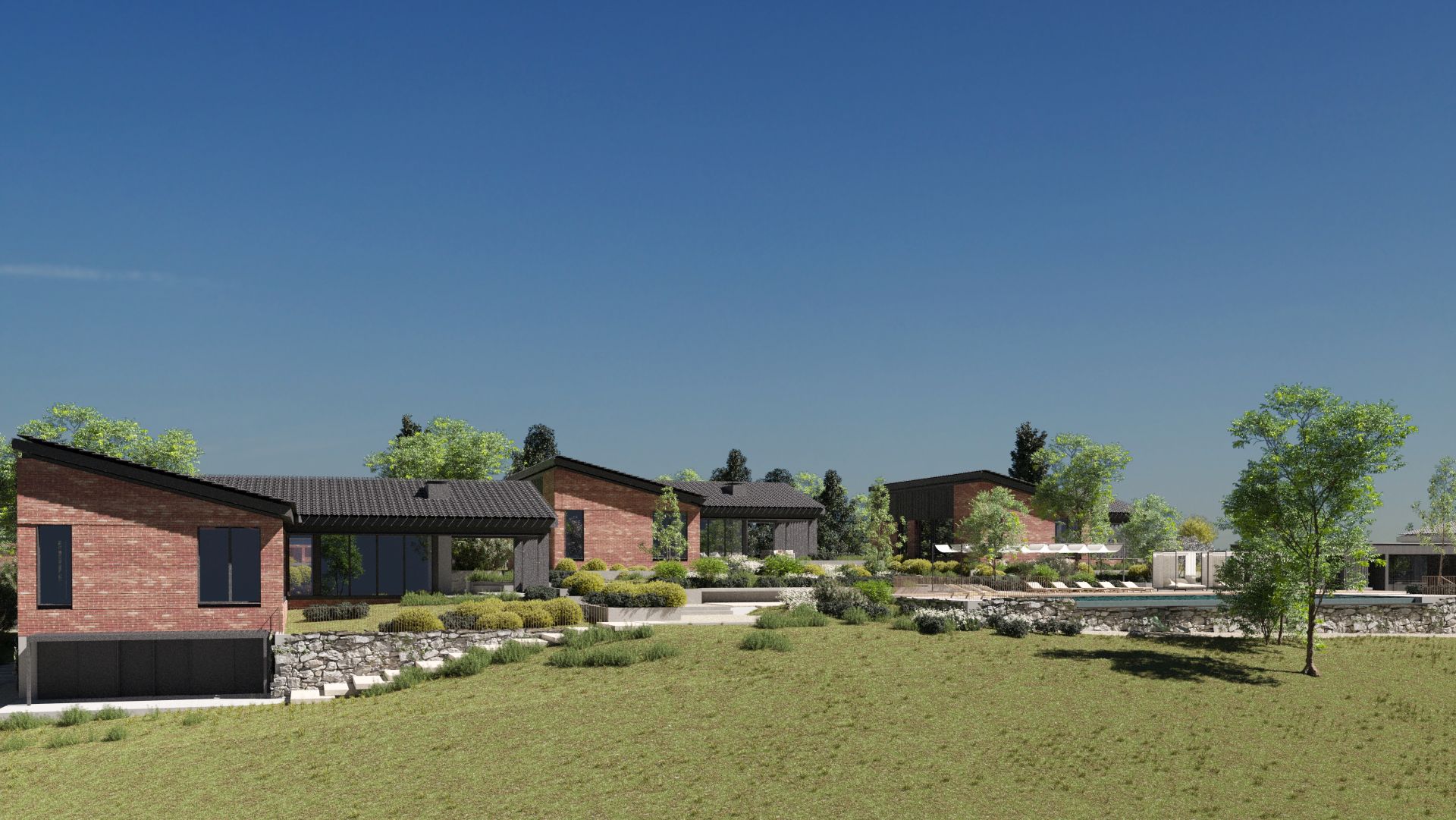 U pitanju je vikend kompleks koji arhitektonski oblikovao beogradski INKA Studio, a prema želji klijenta da se na parceli od 0,8 hektara postave tri kuće sa pratećim sadržajima – bazenom, paviljonom za zajednička okupljanja i aktivnosti i sportskim terenima, te obezbedi komfor za više porodica različitih generacija.