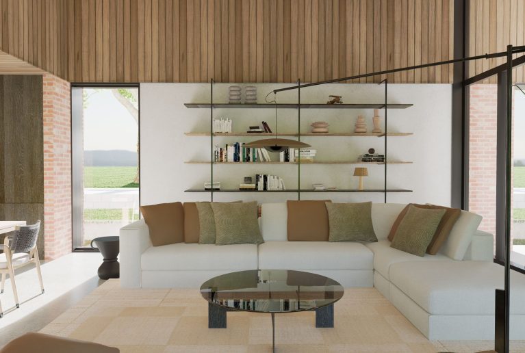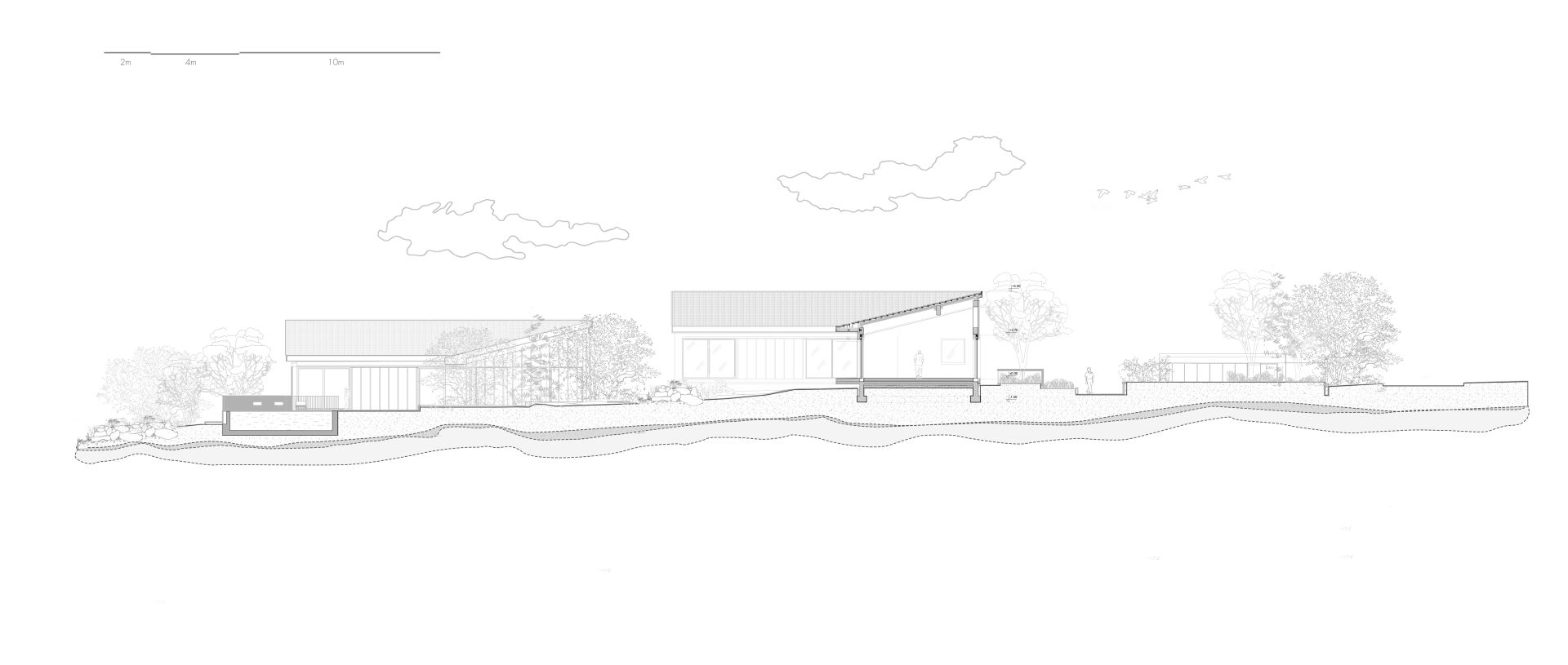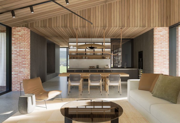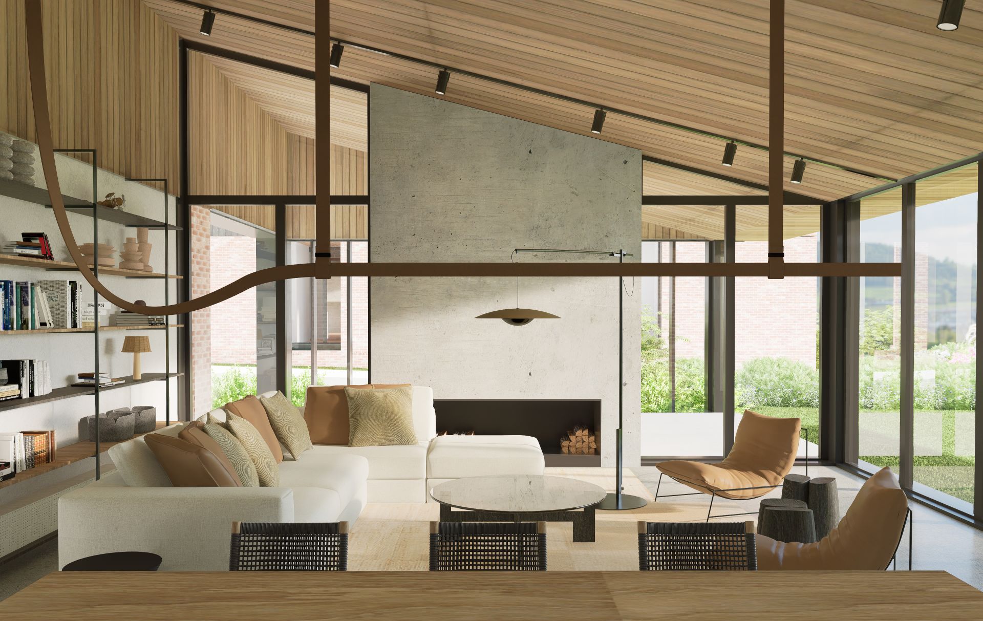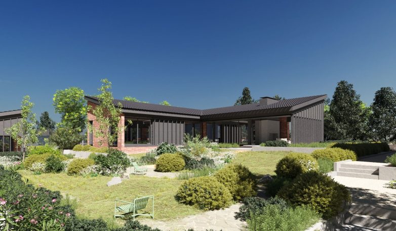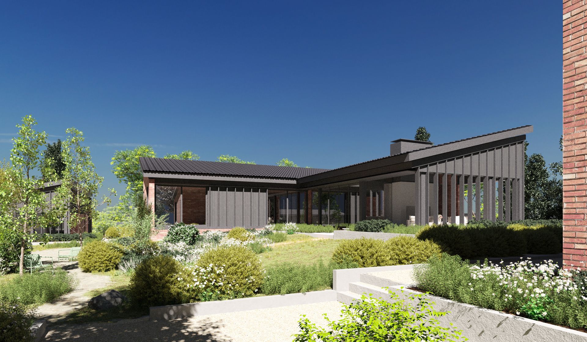 U pitanju je vikend kompleks koji arhitektonski oblikovao beogradski INKA Studio, a prema želji klijenta da se na parceli od 0,8 hektara postave tri kuće sa pratećim sadržajima – bazenom, paviljonom za zajednička okupljanja i aktivnosti i sportskim terenima, te obezbedi komfor za više porodica različitih generacija.