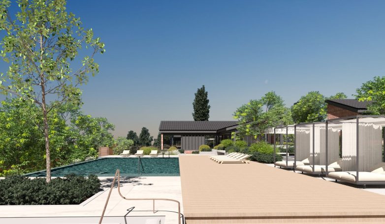 „To su postamenti kuće C, bazena i pomoćnog objekta. Kako se penjemo više, objekti dobijaju obradu fasada od opeke što praktično imamo kod svih objekata uključujući i portirnicu“ – kažu iz studija i dodaju: