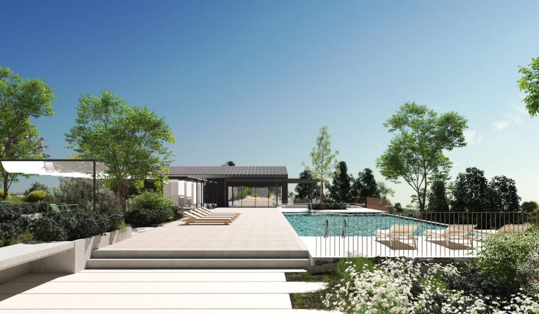 Bazen je najprivatnija zona među sadržajima, te se nalazi u najnižoj tački parcele zajedno sa pratećim paviljonom.