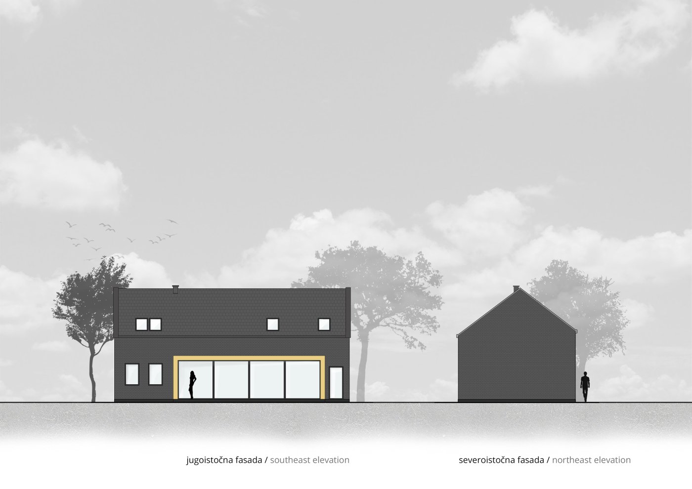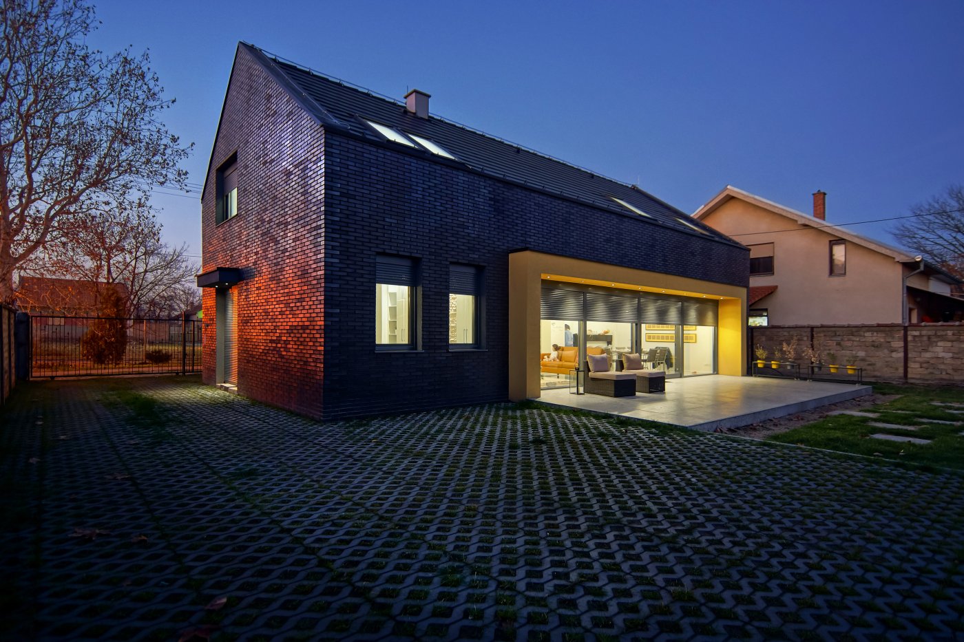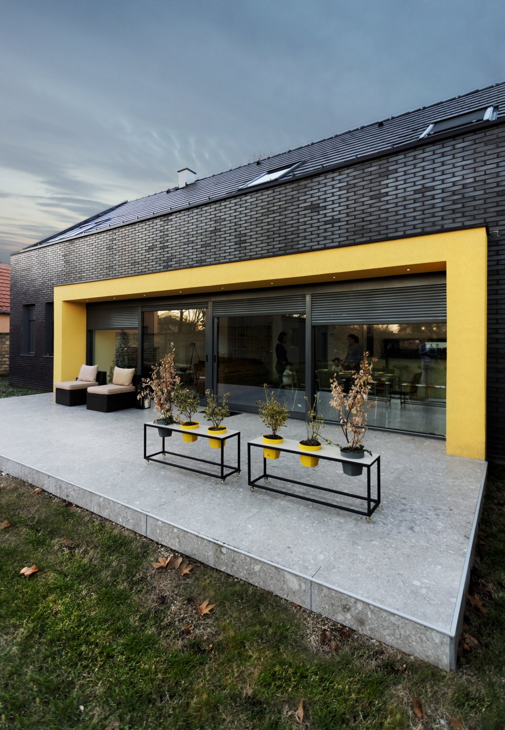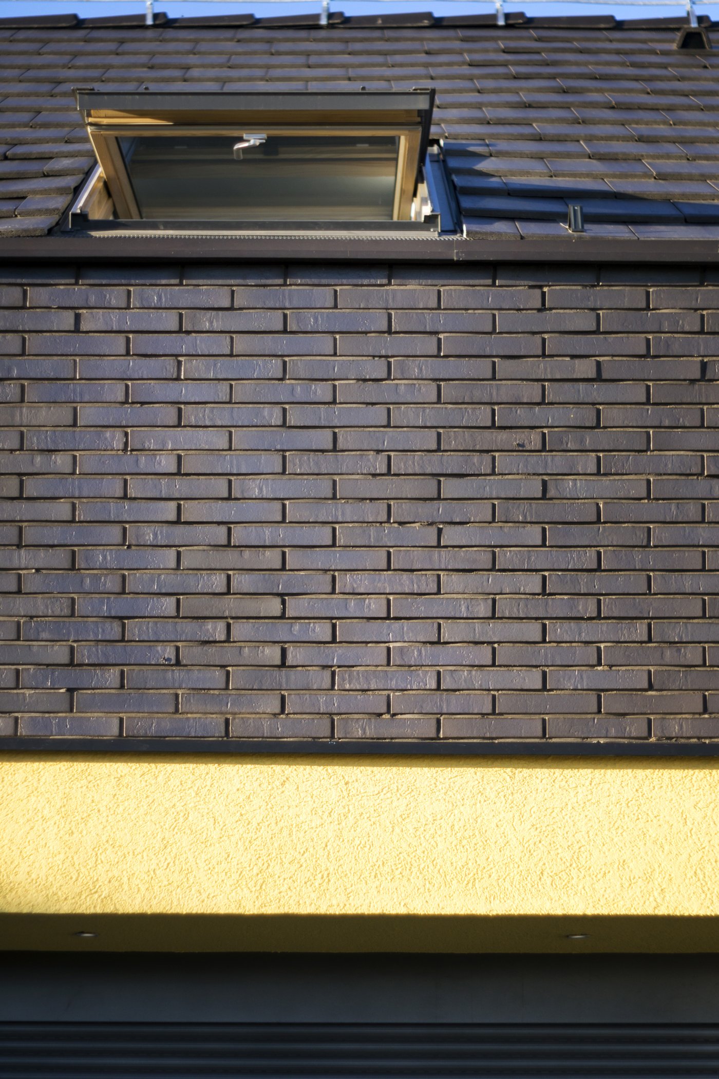 Blago reflektujuća crna fasadna opeka u kombinaciji sa tamnim crepom kao krovnim pokrivačem daje kući monolitan izgled, delimično razbijen žutim detaljima i staklenim površinama. Reflektujuća opeka daje različite efekte tokom dana, u zavisnosti od svetlosti i ugla posmatranja.