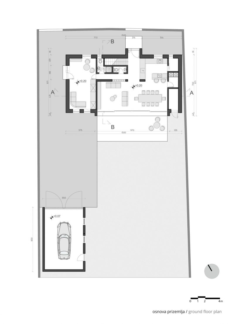 U funkcionalnom smislu, kuća od 150 metara kvadratnih podeljena je na prizemlje i potkrovlje. Prizemljem dominira dnevni boravak sa kuhinjom i trpezarijom, a iz ovog prostora se izlazi na terasu prema dvorištu. Pored toga, u prizemlju se nalazi i spavaća soba, koja ima poseban ulaz i kupatilo, pa može da funkcioniše kao nezavisna celina.
