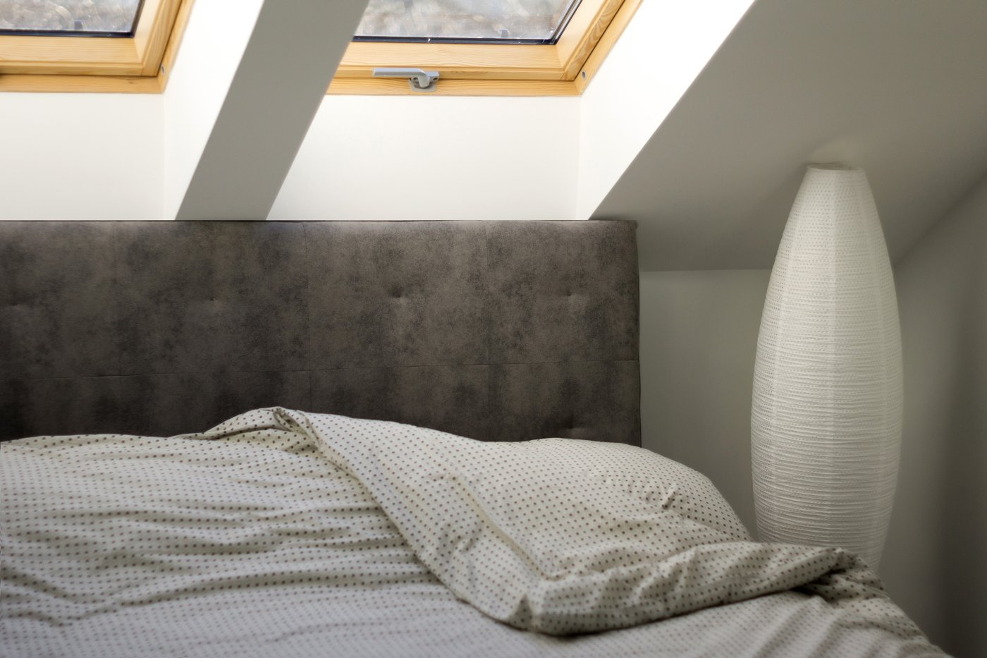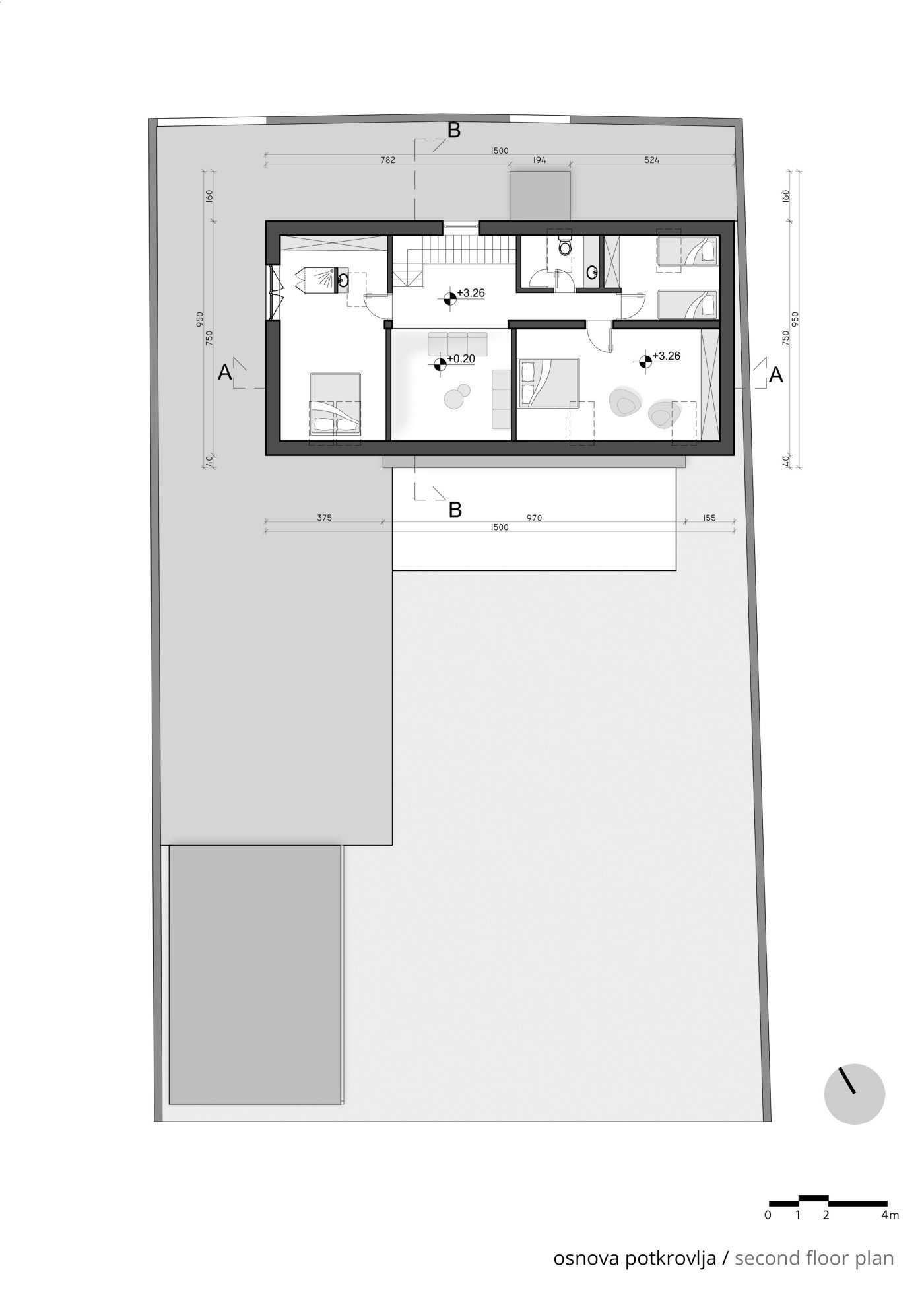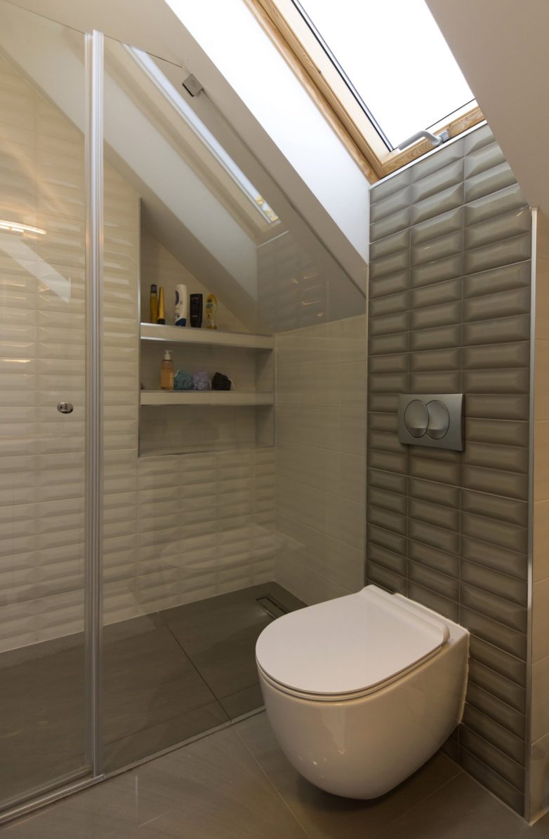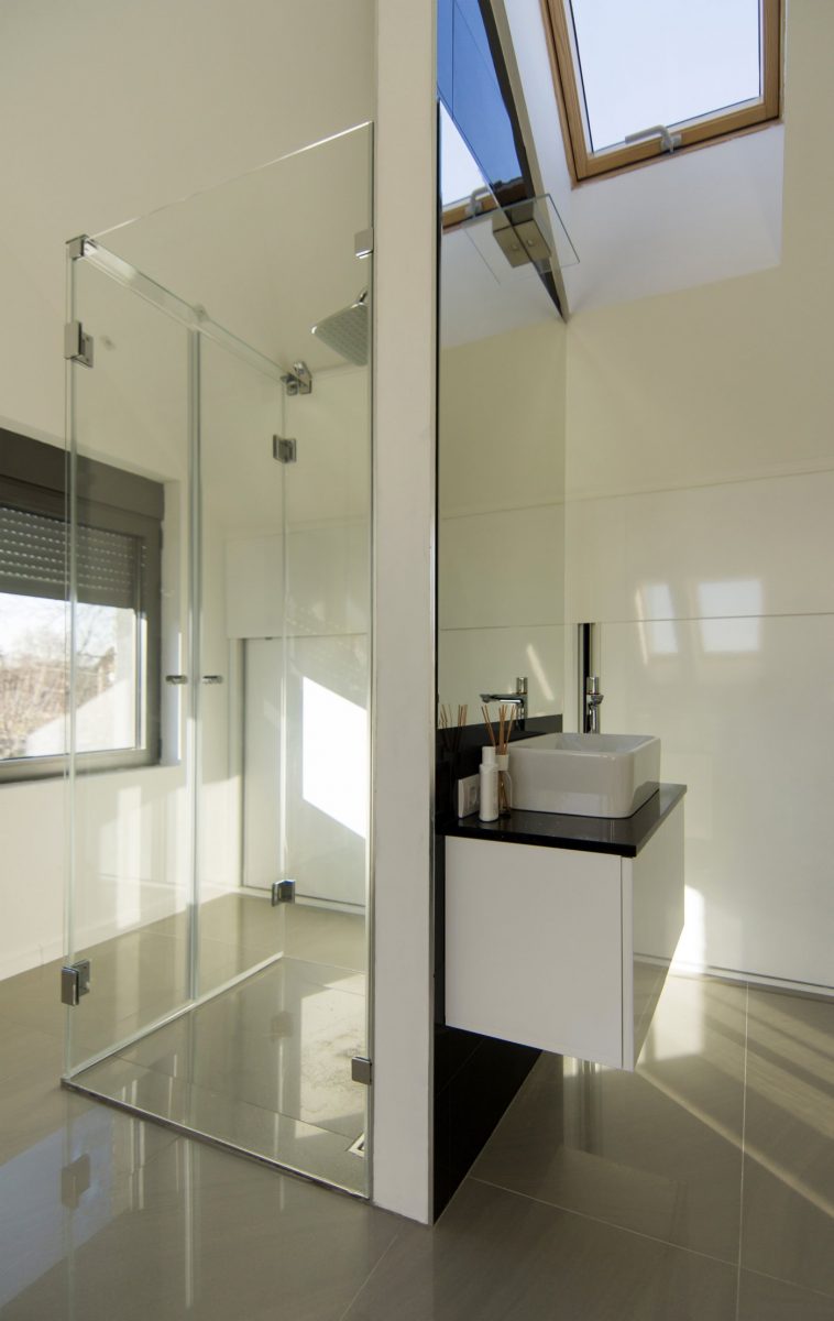 Na potkrovlju se nalaze tri spavaće, povezane galerijskim prostorom. Želja investitora bila je da svi ukućani povode što više vremena zajedno, što je rezultiralo otvorenim prizemljem gde dnevni boravak i trpezarija zajedno čine glavni prostor okupljanja.