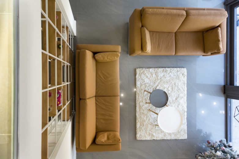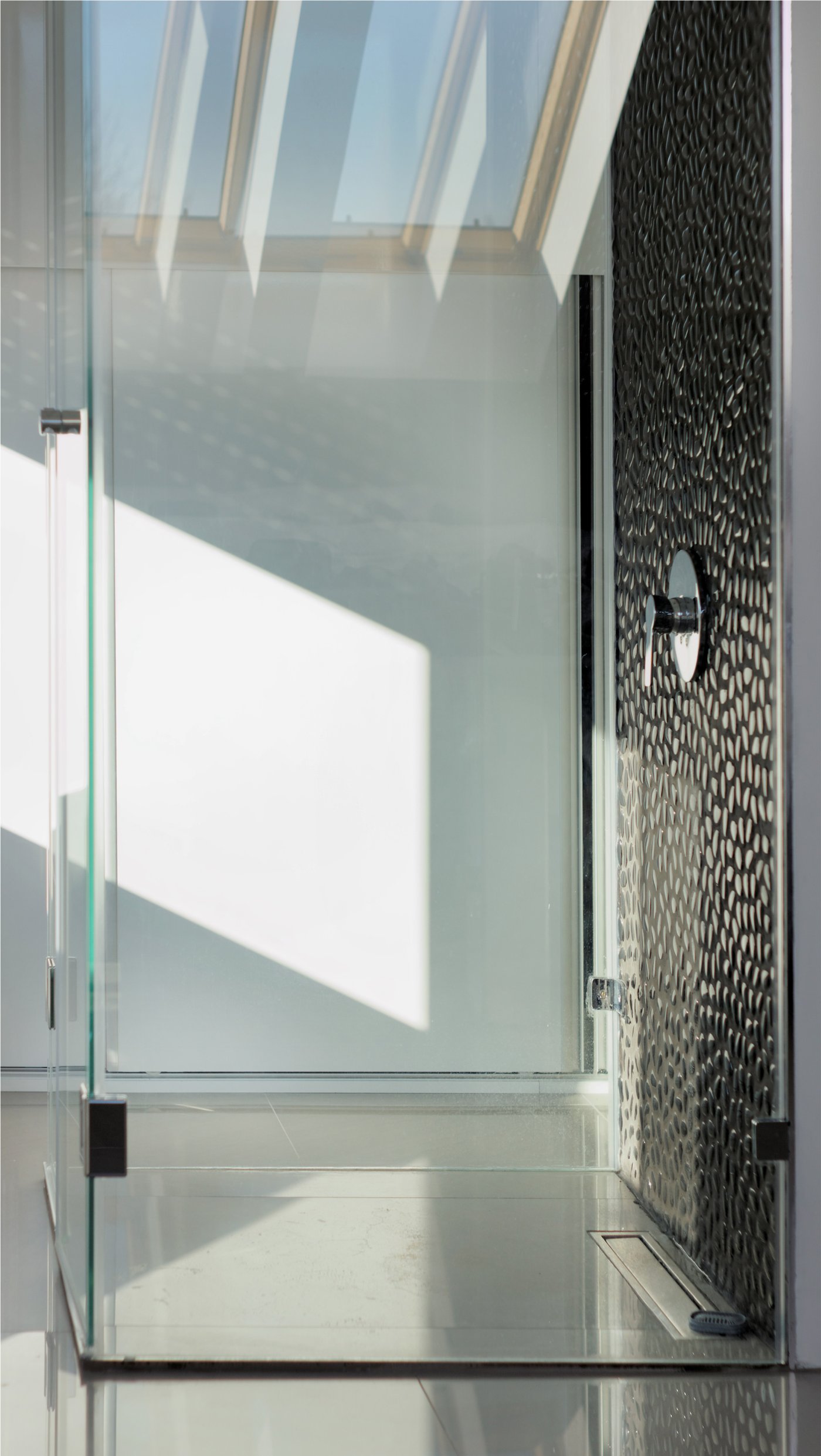 Kao kontrast tamnijoj spoljašnjosti, unutrašnjost kuće je znatno svetlija zahvaljujući svetlim tonovima i velikim staklenim površinama. Otvoreni deo dnevnog boravka s galerijom dodatno doprinosi upadu velike količine dnevne svetlosti, što je takođe bio jedan od zahteva investitora.