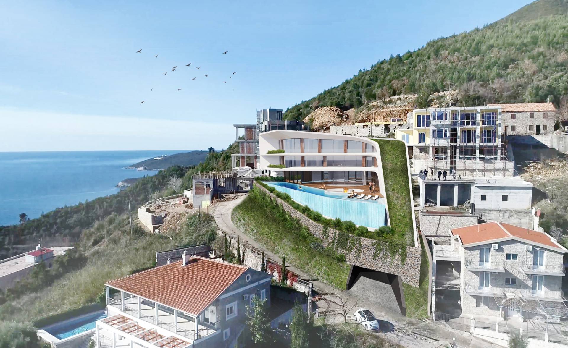 Pozicioniranje glavnog dela strukture, zelene kosine krova i bazena napravljeno je kako bi se obezbedio pogled prema moru, ali i istakli najatraktivniji pogledi – na zaliv Budva i tvrđavu Mogren.
