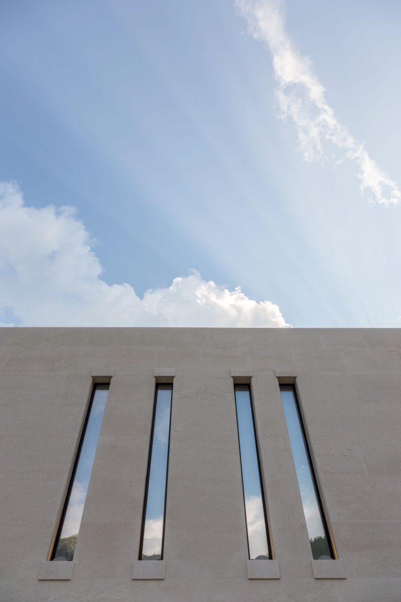 Objekat je zatvoren ka ‘spoljnjem izgrađenom’ artikulacijom svedenih, uzanih vertikalnih otvora koji su dodatno podržani vertikalnom rustikom od bračkog kamena u prizemlju. Kamena plastika, dinamična površinska obrada i završni kamenorezački radovi daju dodatnu vrednost u izvrsnosti ove realizacije.