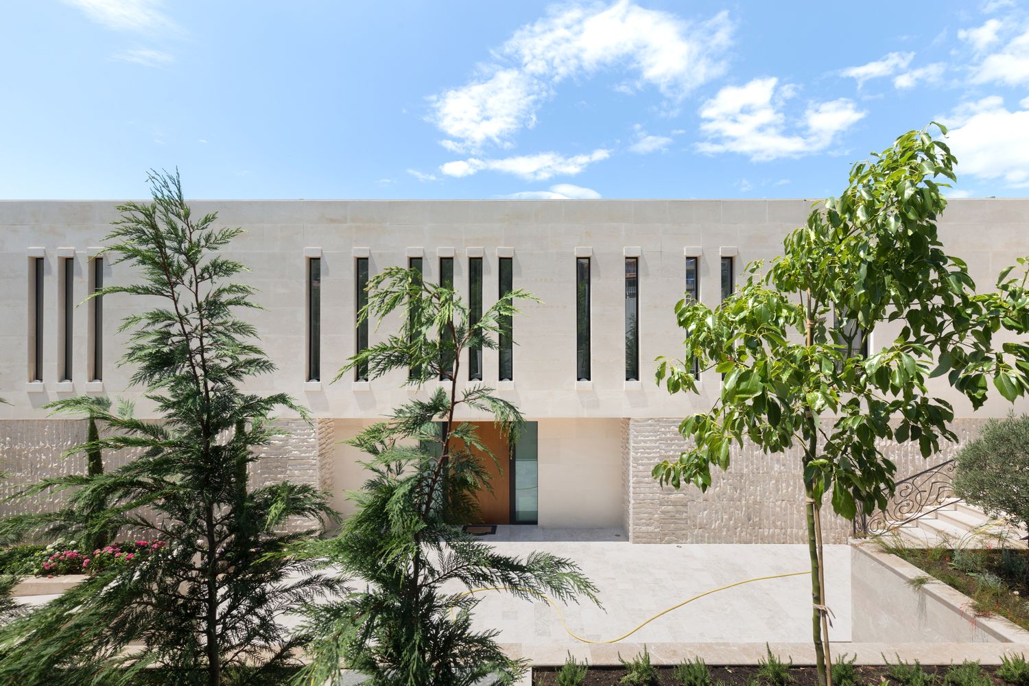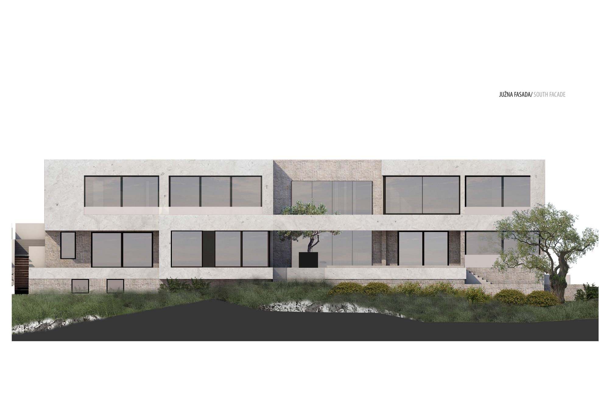 Objekat je zatvoren ka ‘spoljnjem izgrađenom’ artikulacijom svedenih, uzanih vertikalnih otvora koji su dodatno podržani vertikalnom rustikom od bračkog kamena u prizemlju. Kamena plastika, dinamična površinska obrada i završni kamenorezački radovi daju dodatnu vrednost u izvrsnosti ove realizacije.